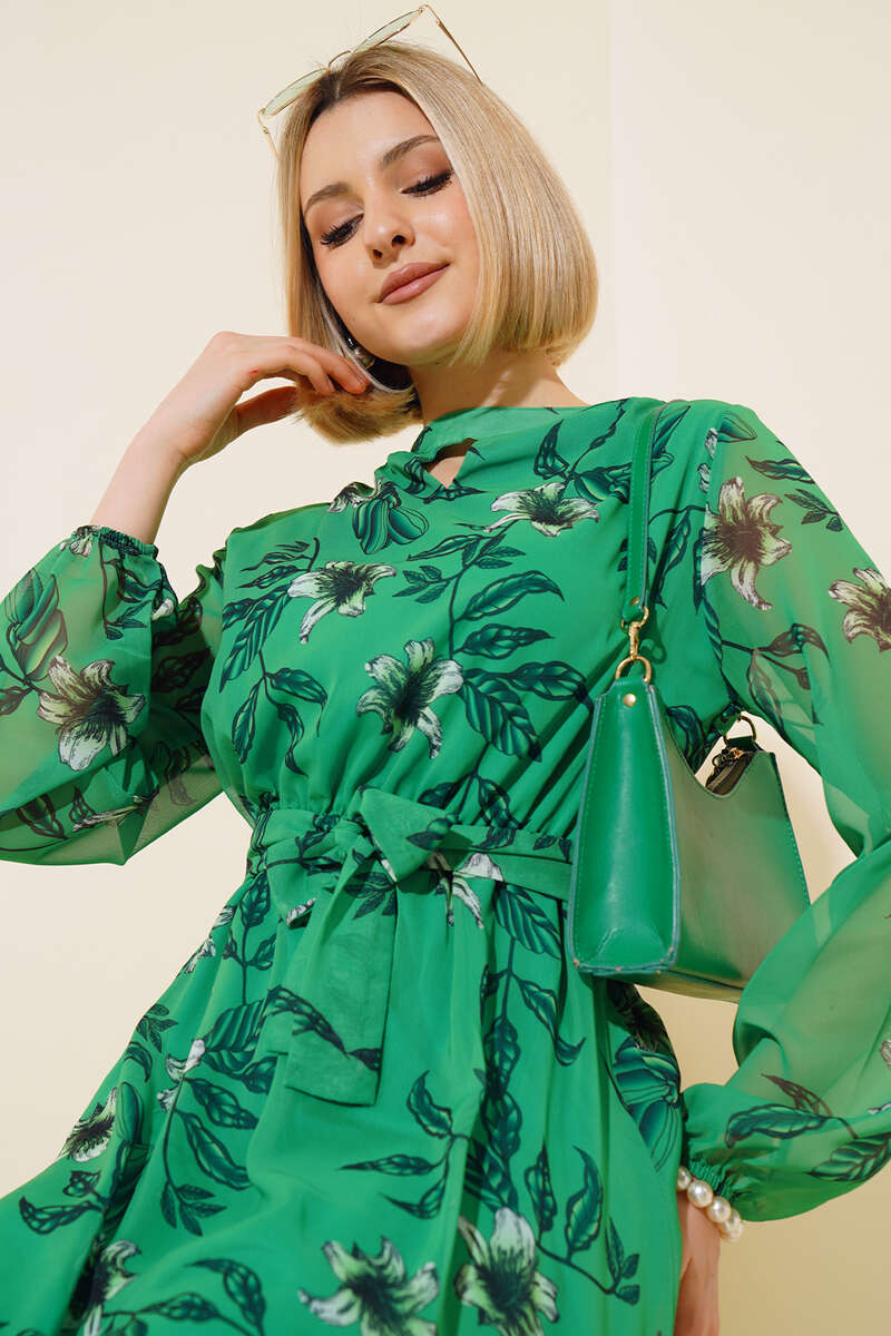 Şifon Çiçek Desenli Elbise Yeşil