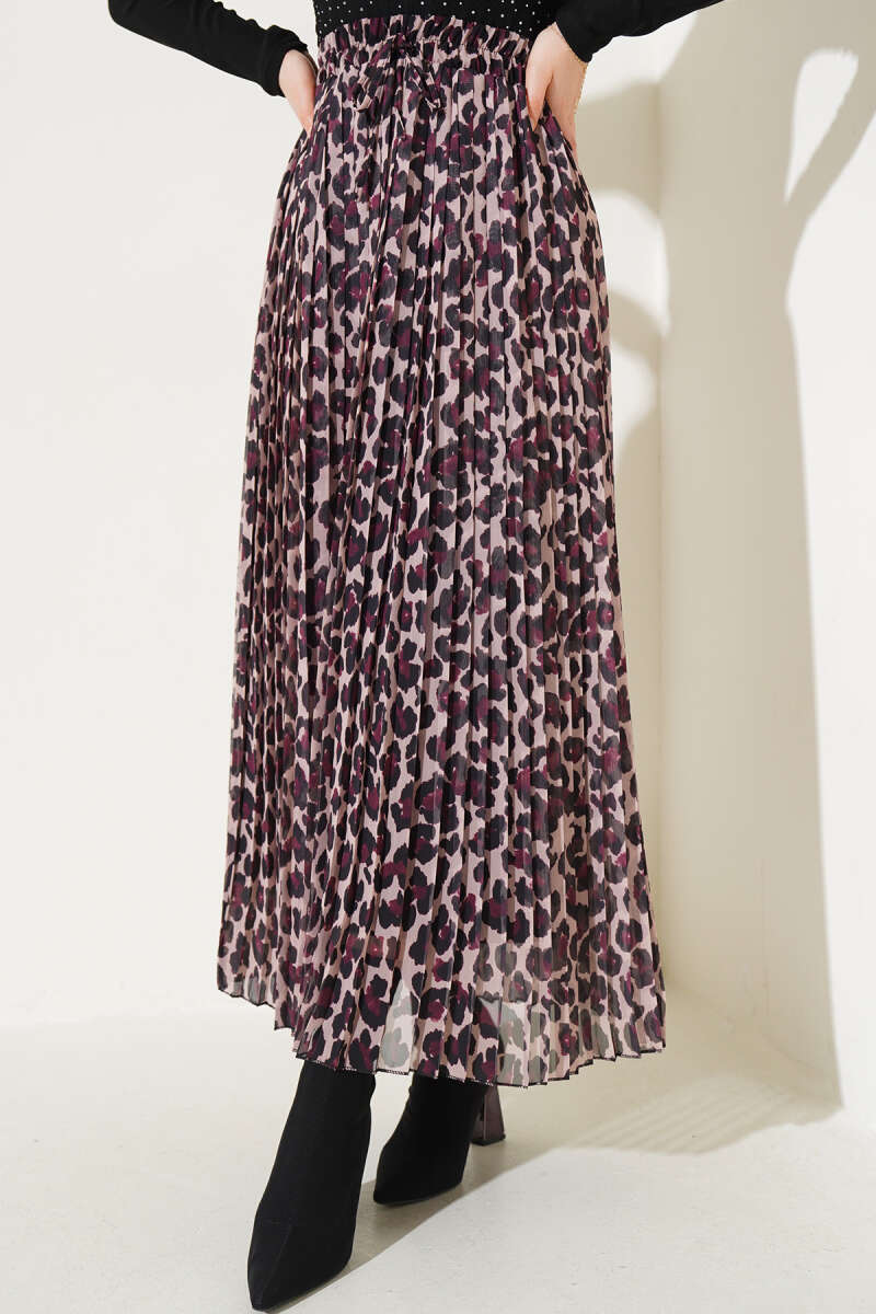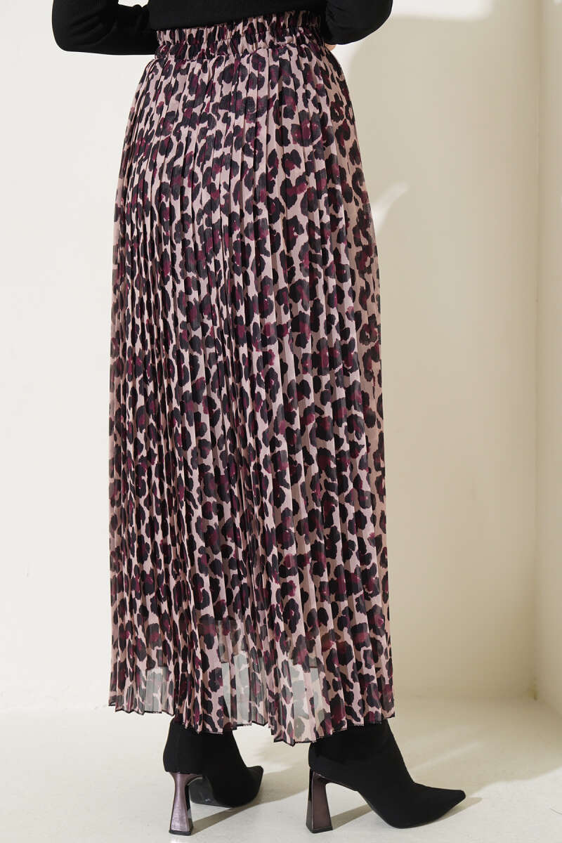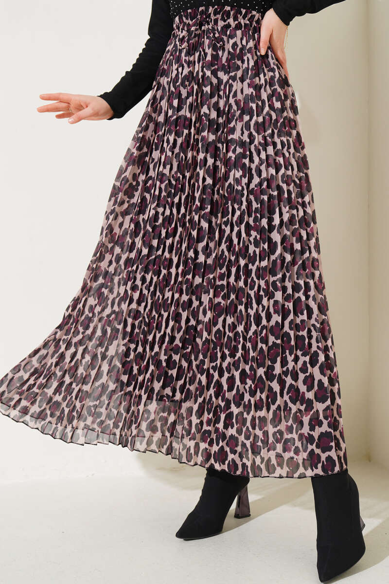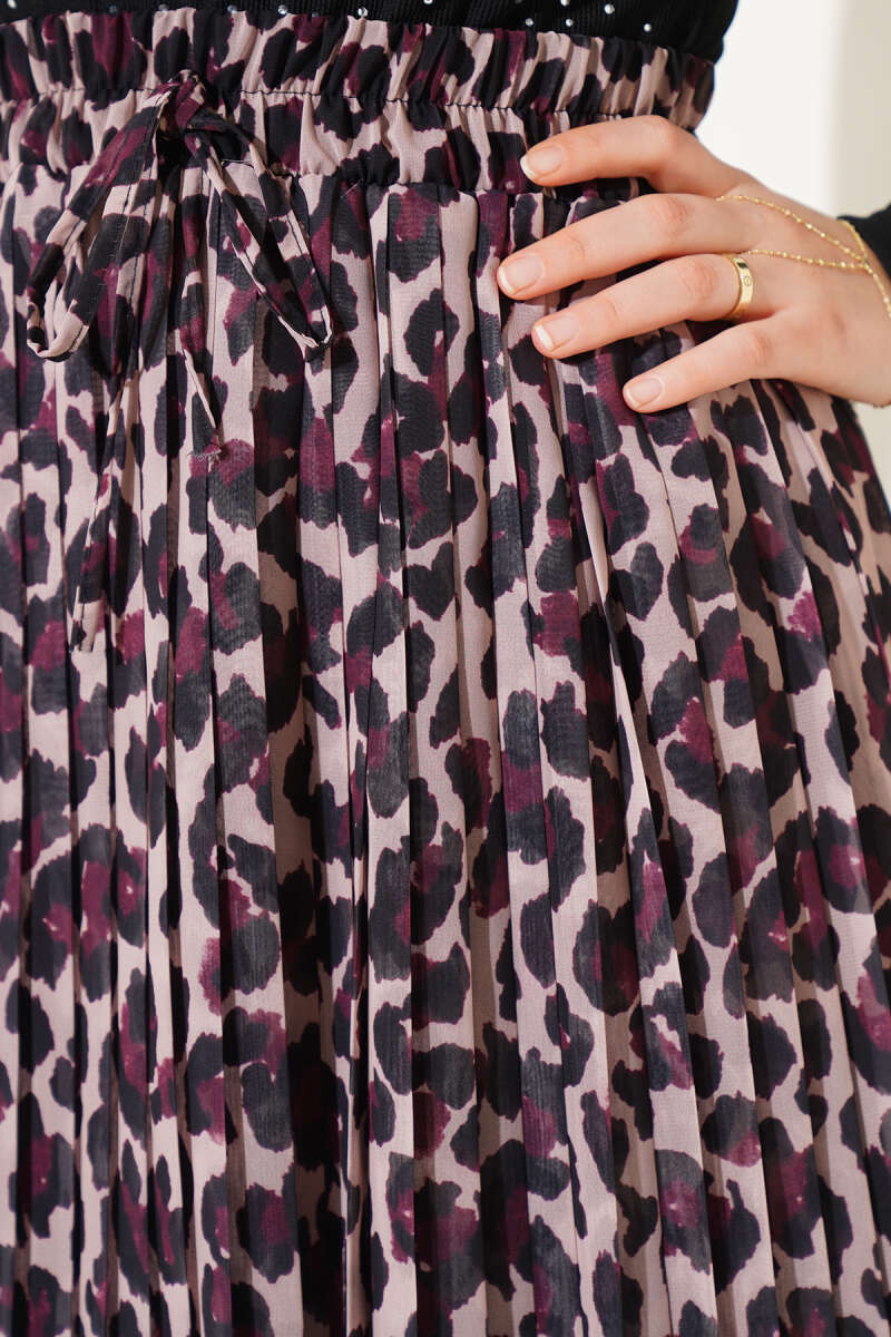 Şifon Pileli Leopar Desen Etek Latte