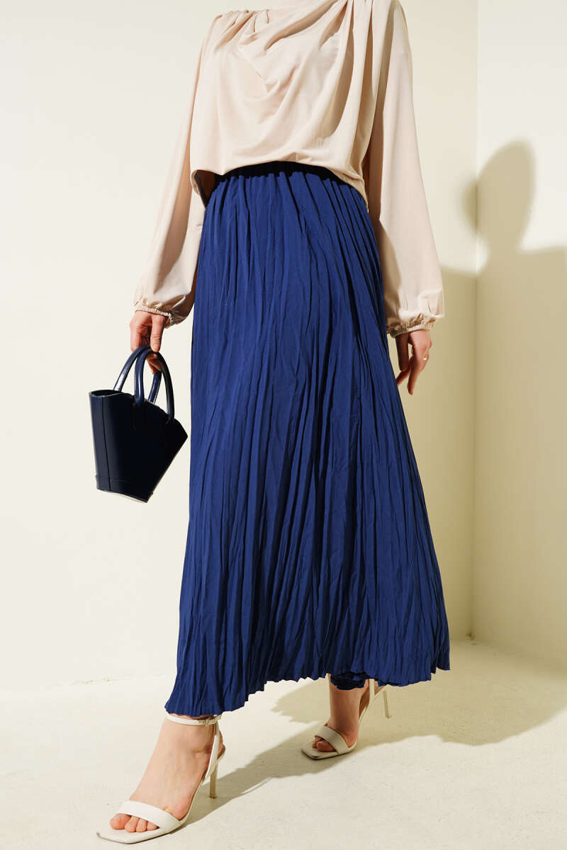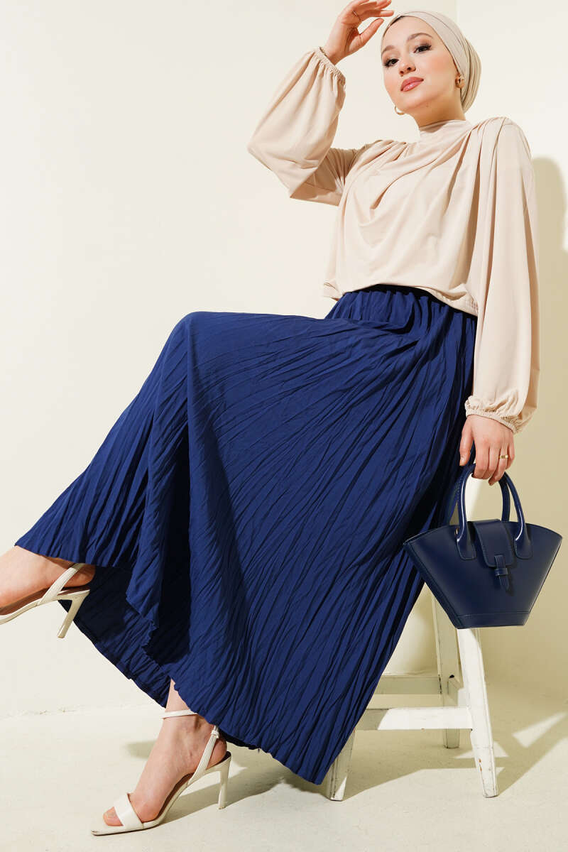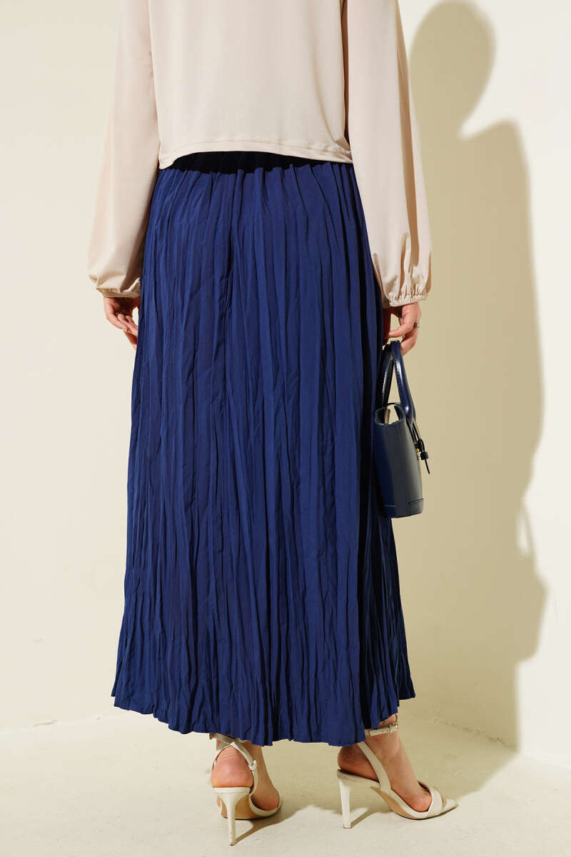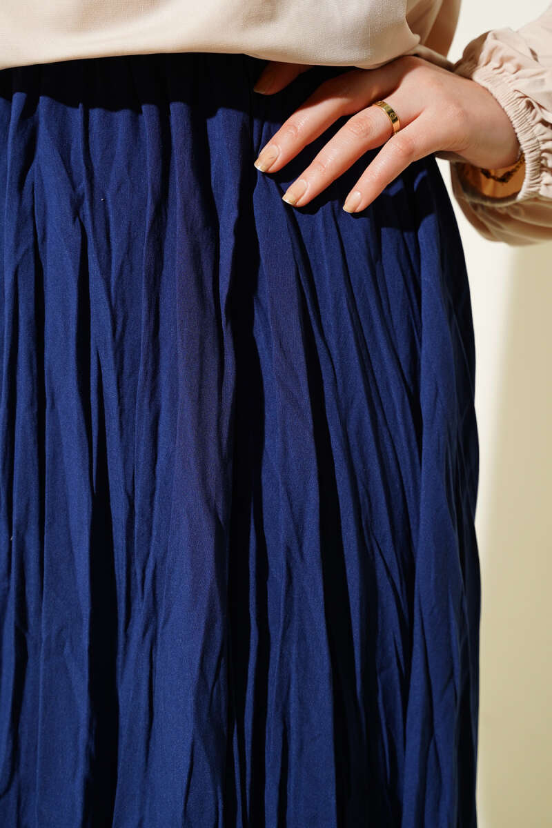 Sık Pileli Bel Lastikli Kırışık Etek Lacivert