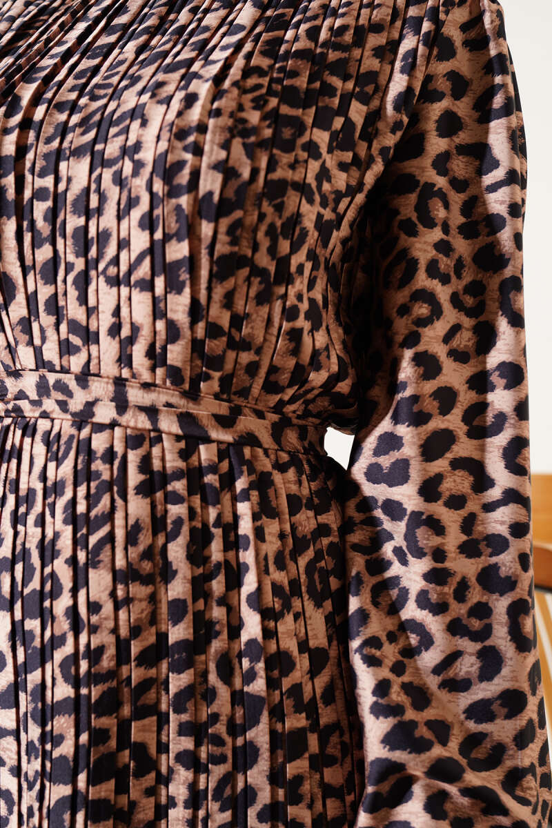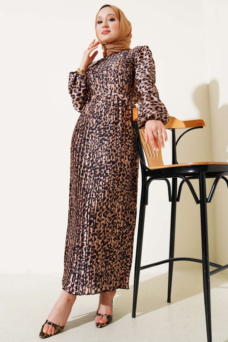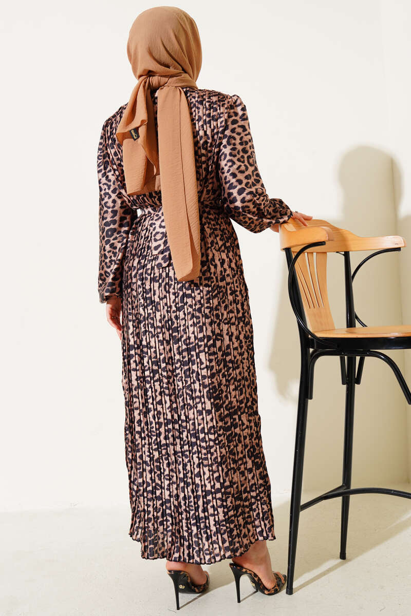 Sık Pileli Leopar Desen Saten Elbise Camel