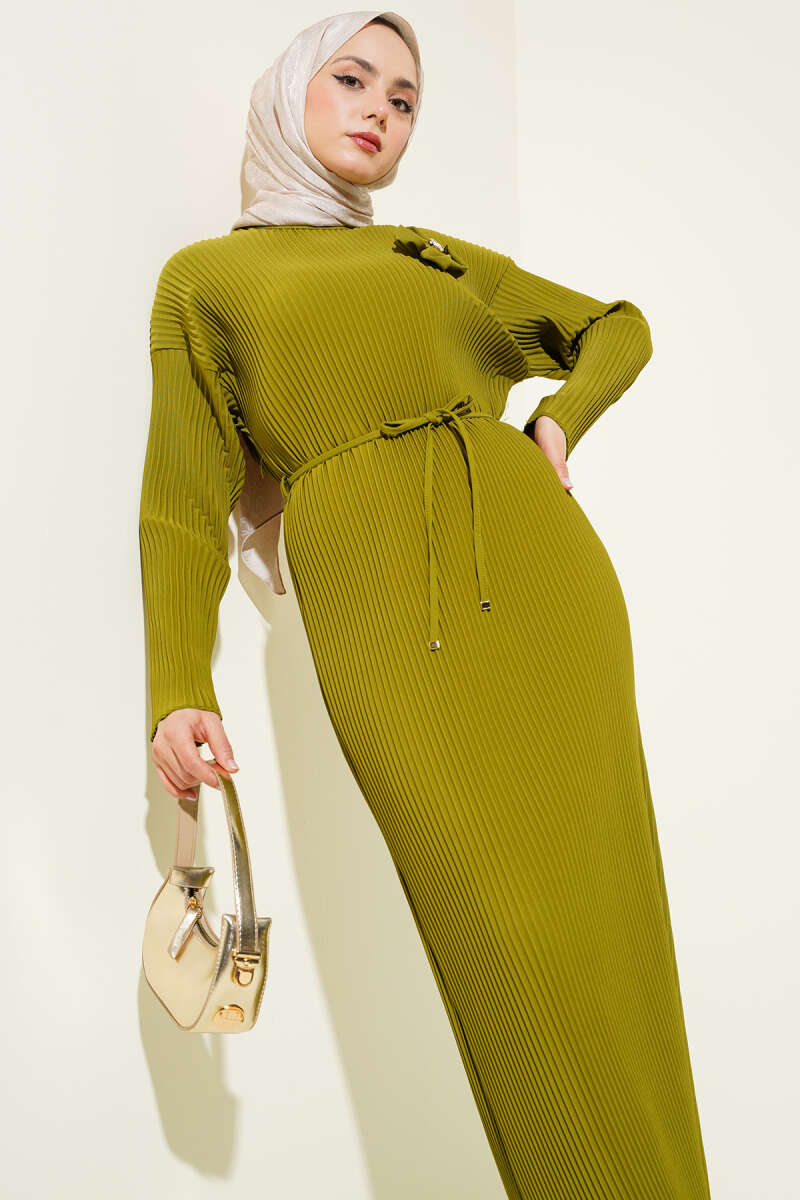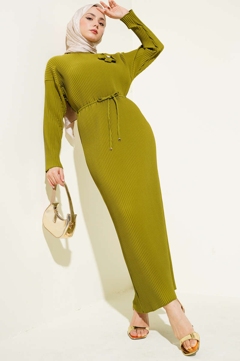 Kat Kat Kuşaklı Terikoton Elbise Haki