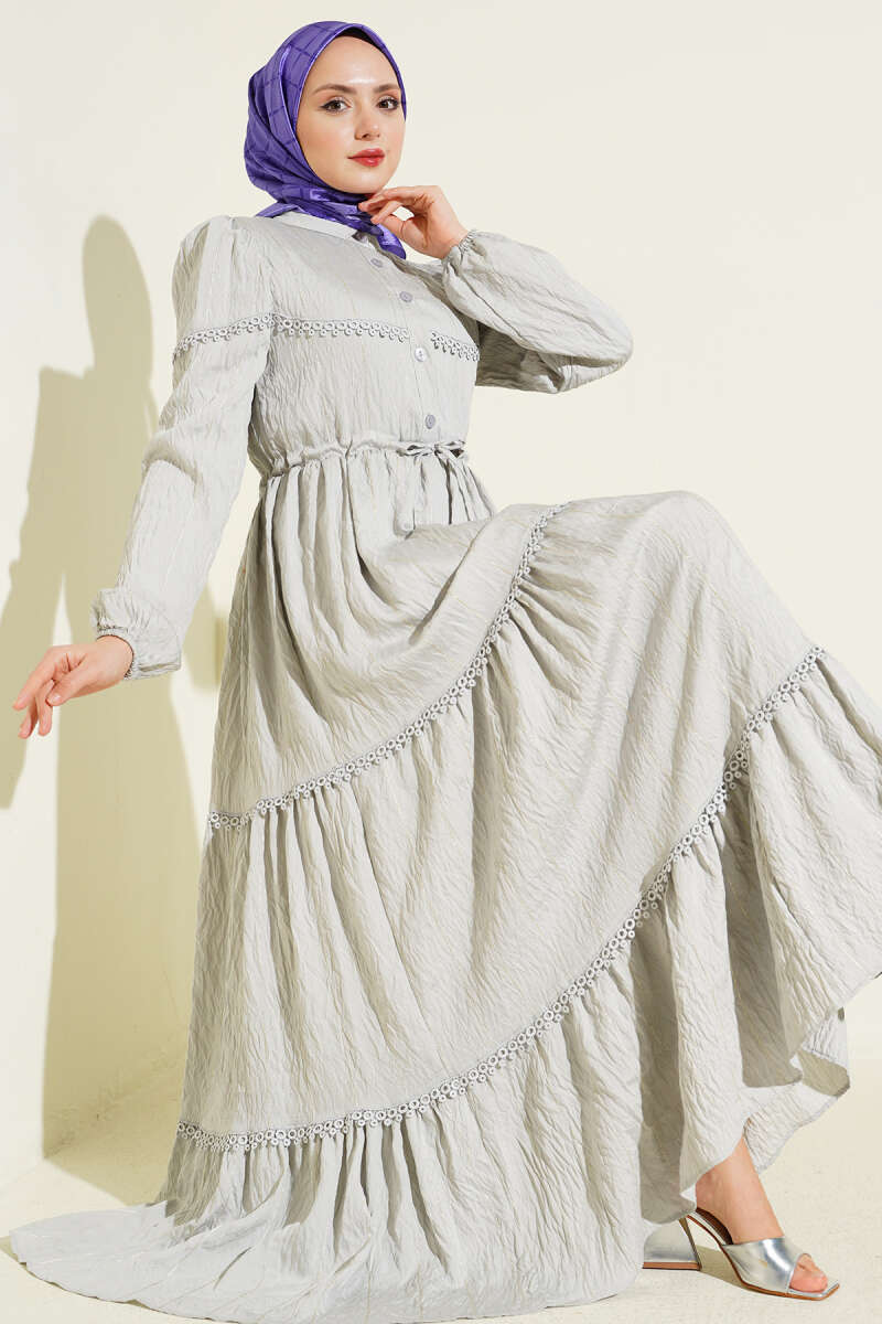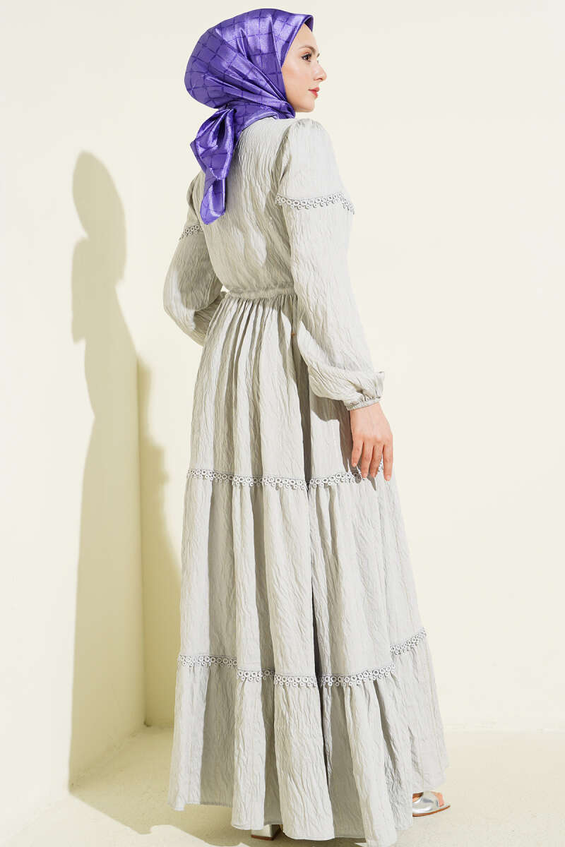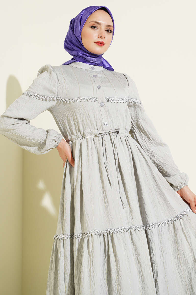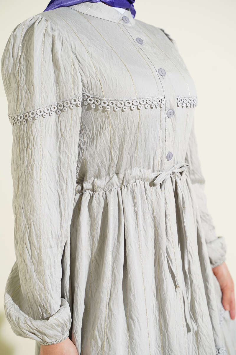 Sim Çizgili Güpür Detaylı Elbise Gri