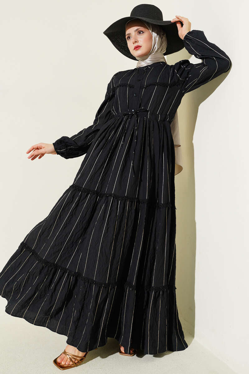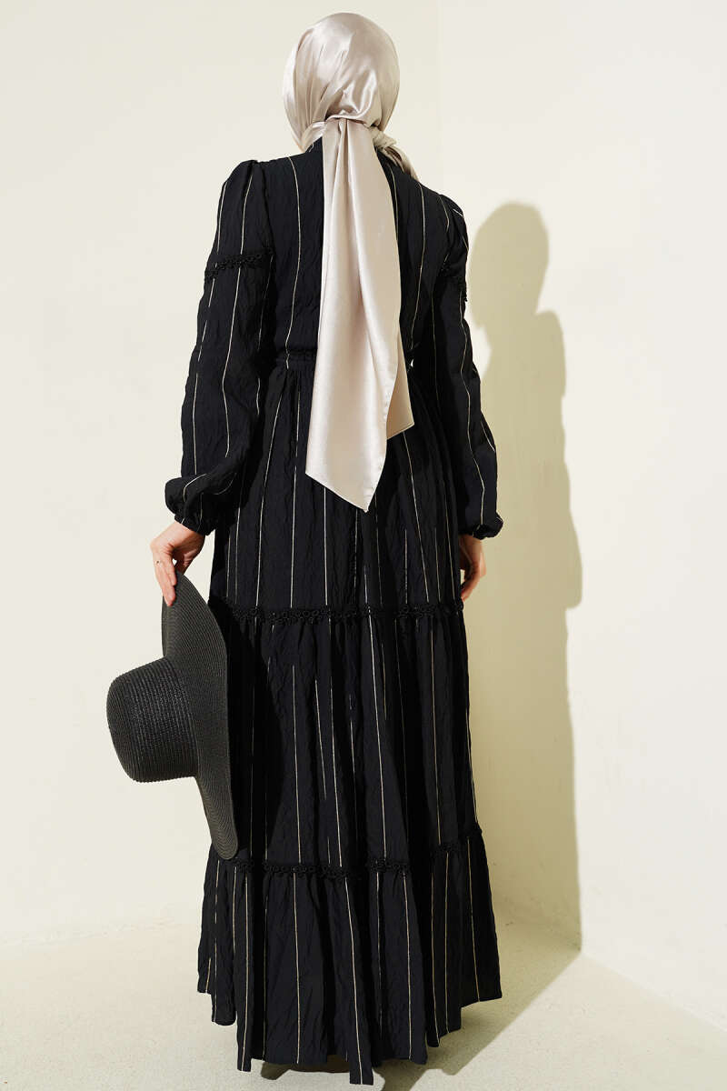 Sim Çizgili Güpür Detaylı Elbise Siyah