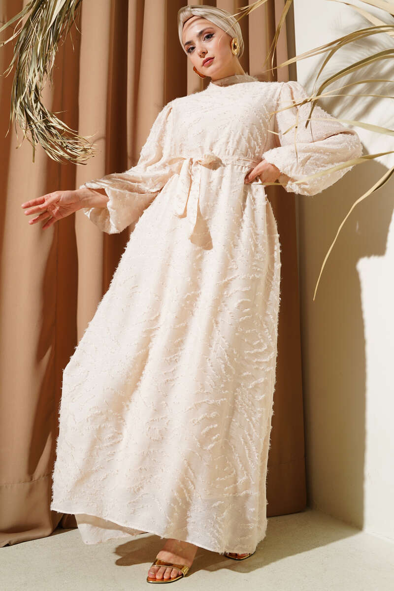 Omuz Pelerin Detaylı Abiye Elbise Bej
