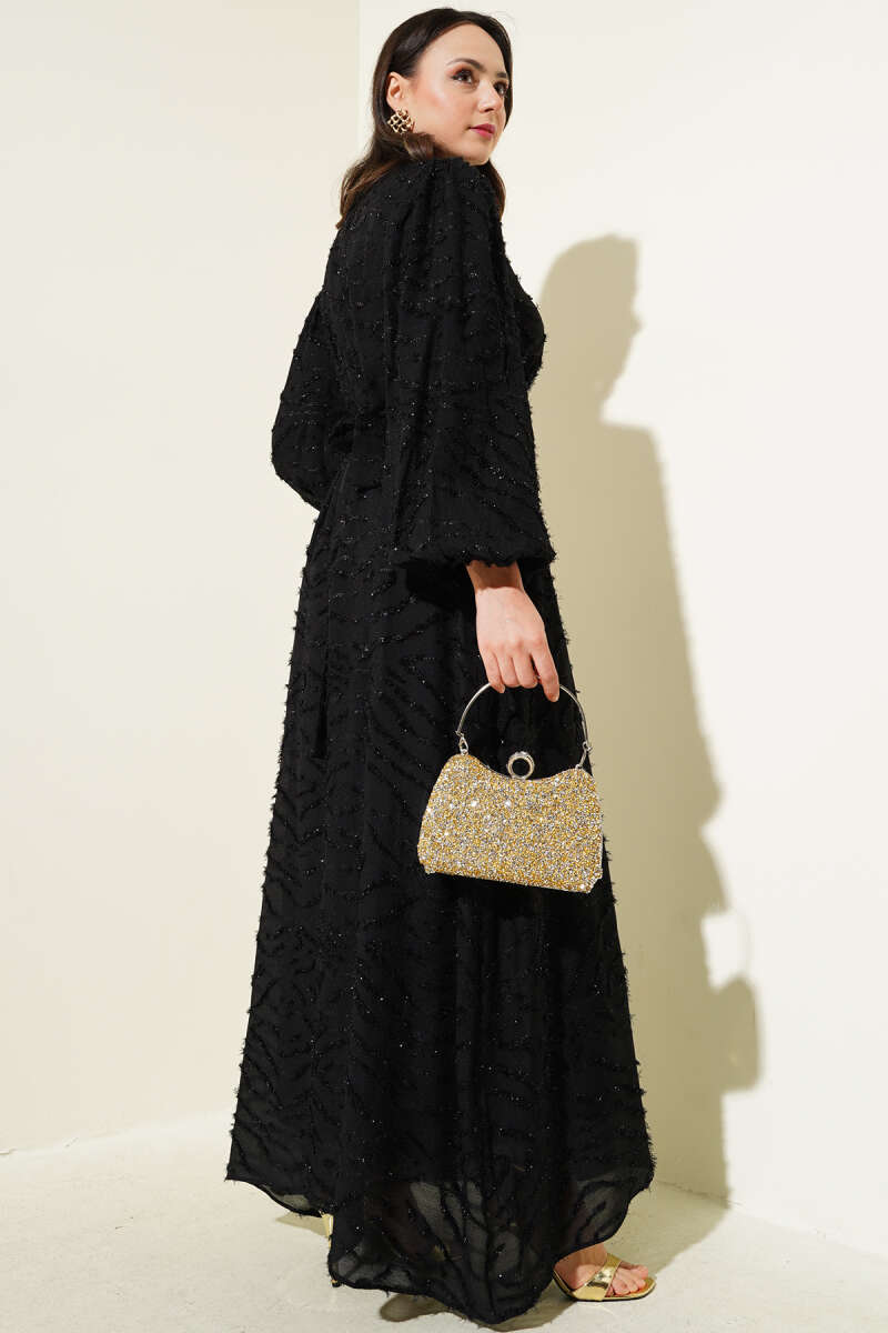 Boydan Piliseli Kemerli Şifon Elbise Siyah