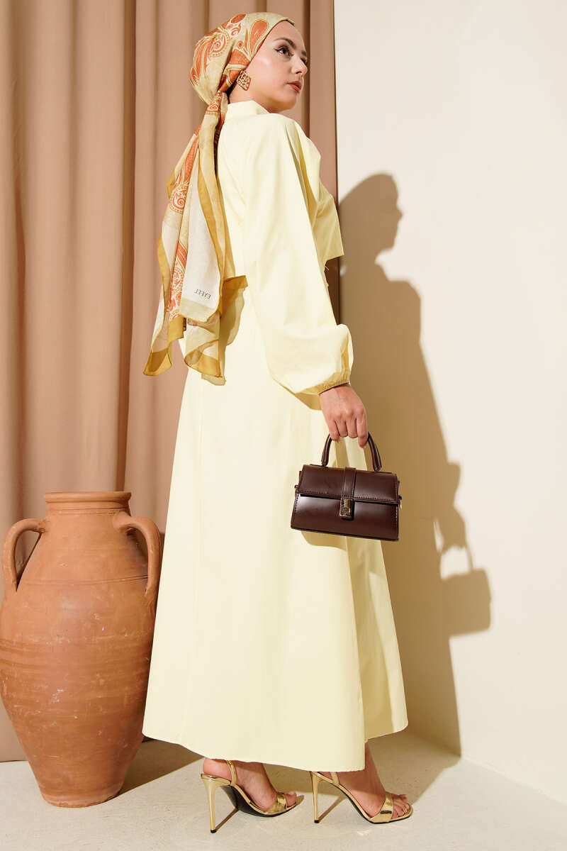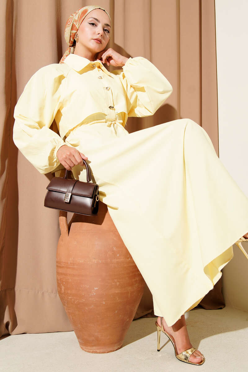 Boydan Tahta Düğmeli Kuşaklı Tensel Elbise Mavi