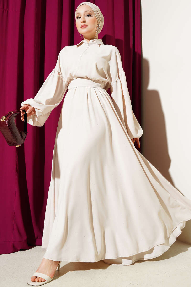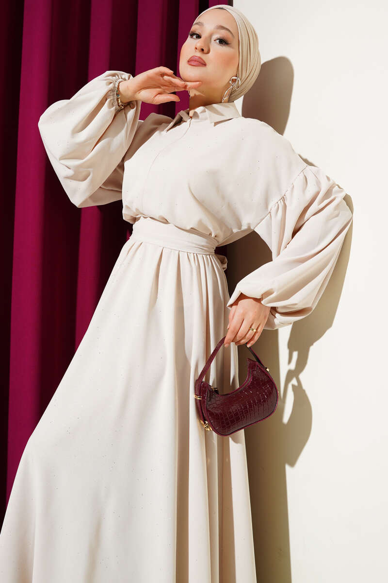 Dik Fitilli Kuşaklı Basic Elbise Bej