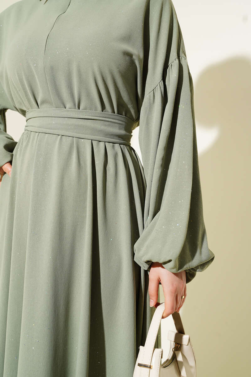 Yatay Çizgili İp Bağcıklı Triko Elbise Haki