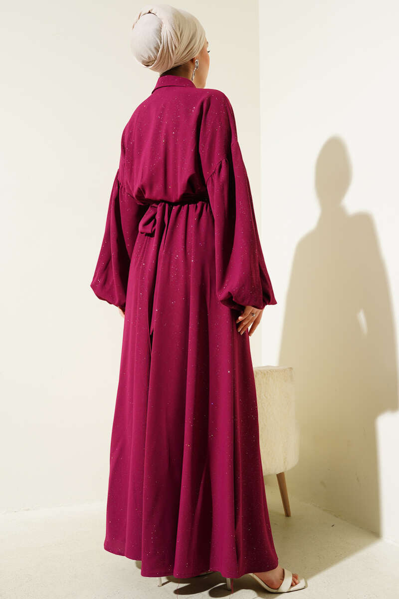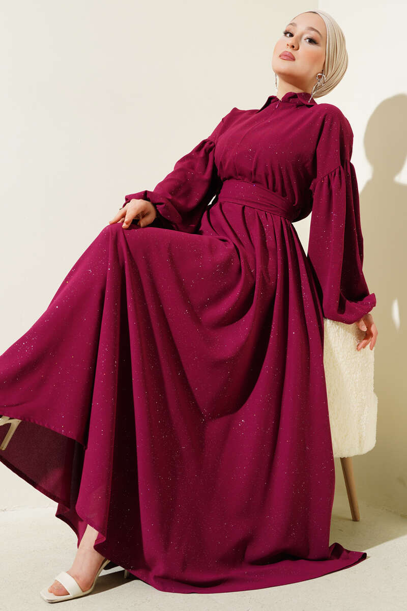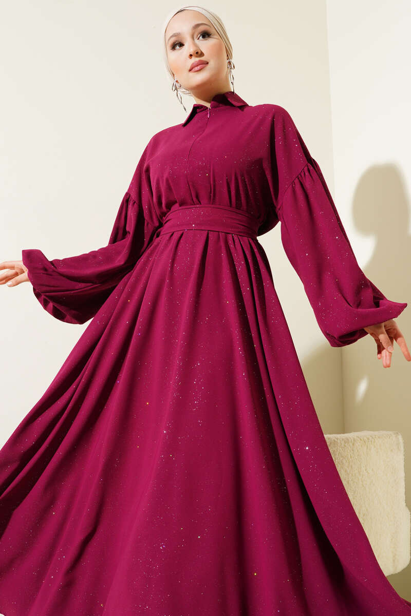 Duble Kol İp Kuşaklı Loyşa Elbise Bordo