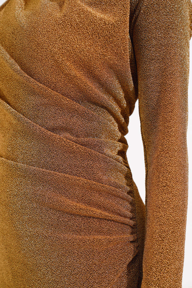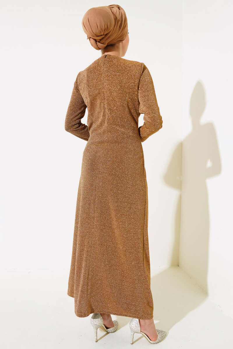 Simli Degaje Yaka Elbise Camel