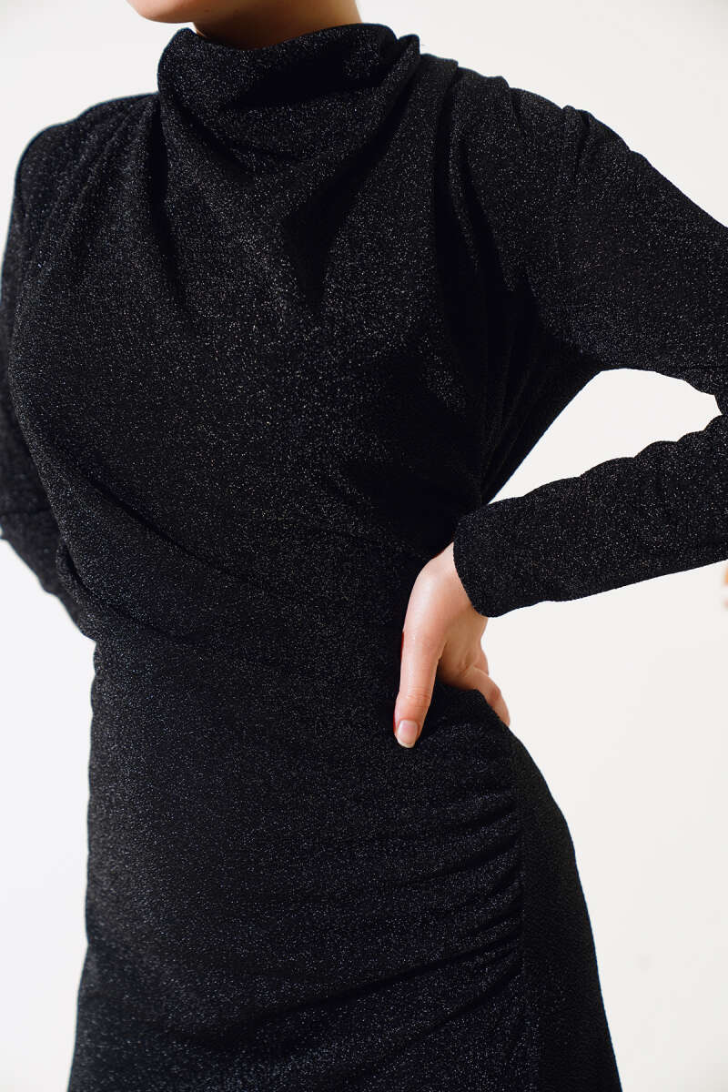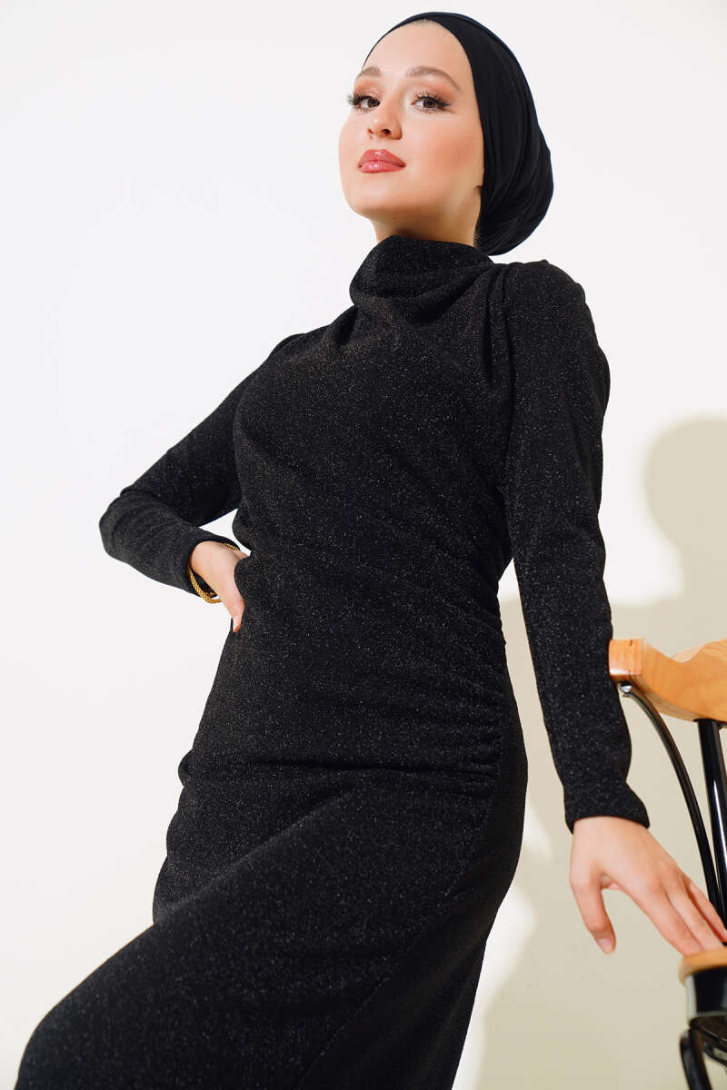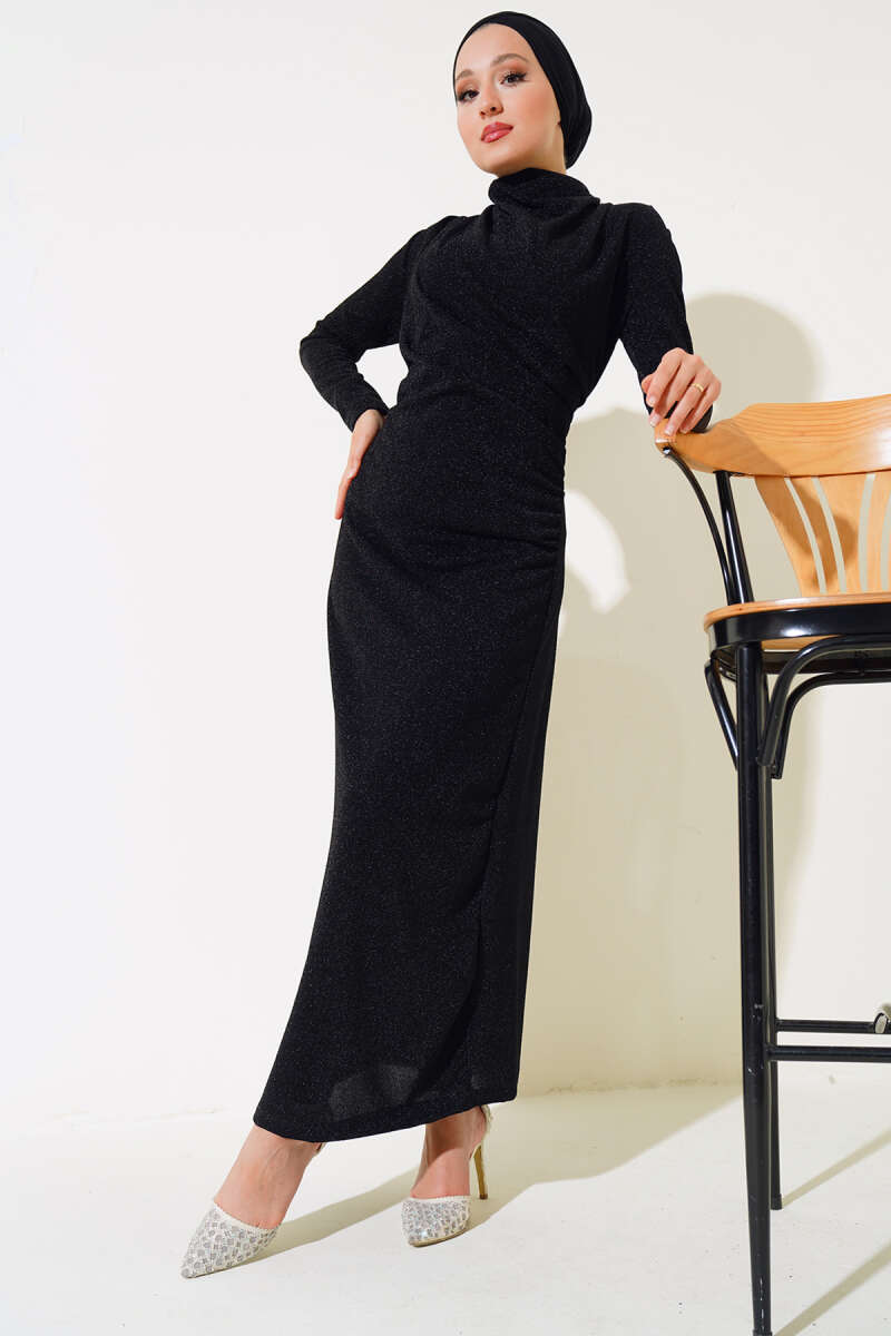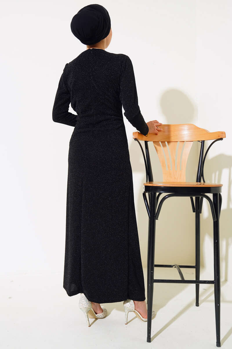 Yan Taş Detaylı Büzgülü Abiye Elbise Siyah
