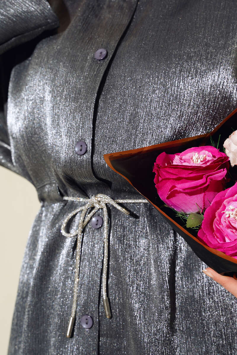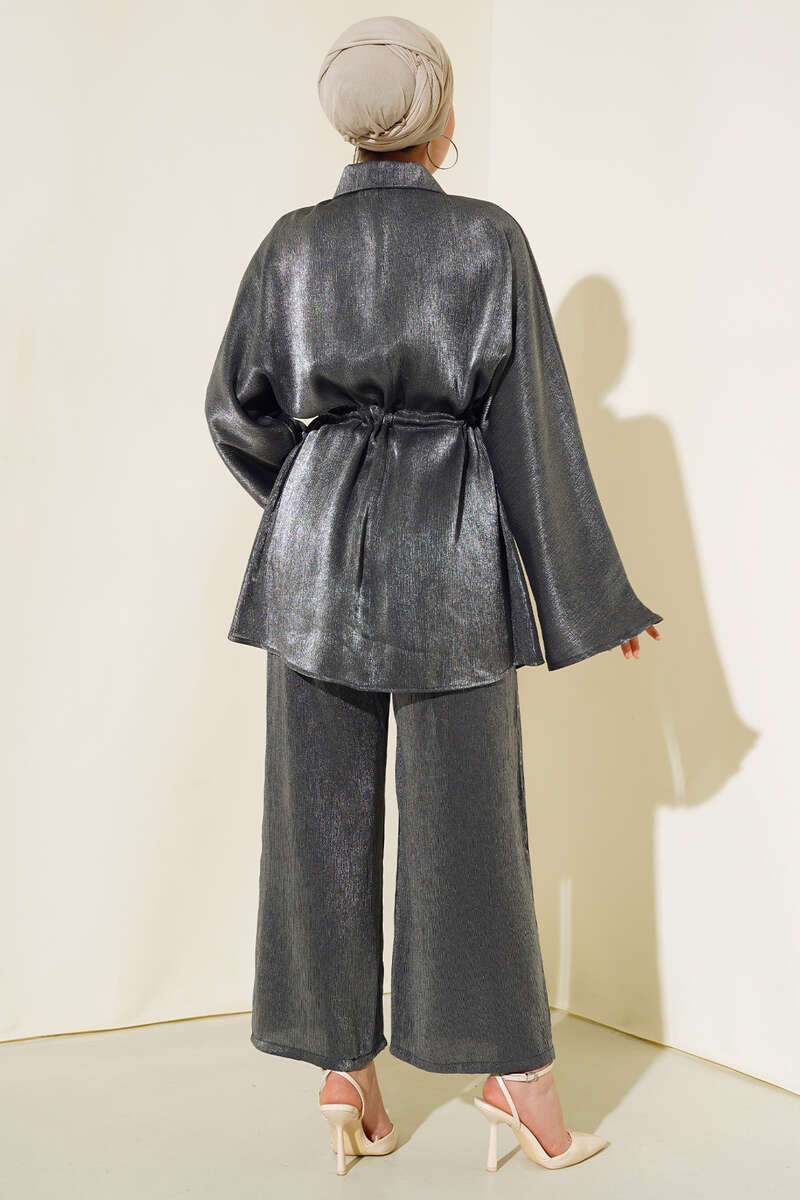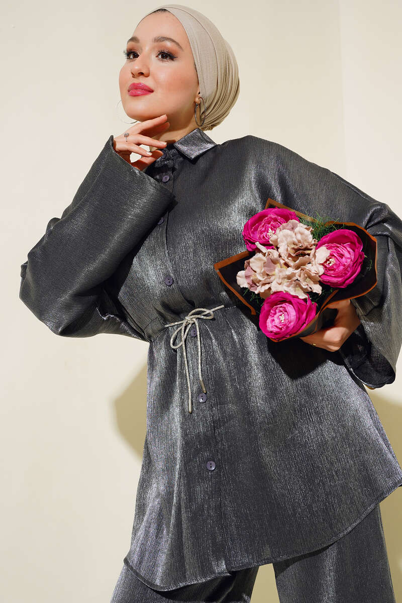 Yeni sezon ikili takım modelimizi çok seveceksiniz. Tunik modelimizin beli tünelli iplidir. Balon kol modeldir. Önü boydan düğmelidir. Pantolonumuzun beli lastiklidir. İki adet yan cebi bulunmaktadır. Geniş paça modeldir. Simli şık ikili takım modelimiz size çok yakışacak. Renk seçeneklerimiz mevcuttur.