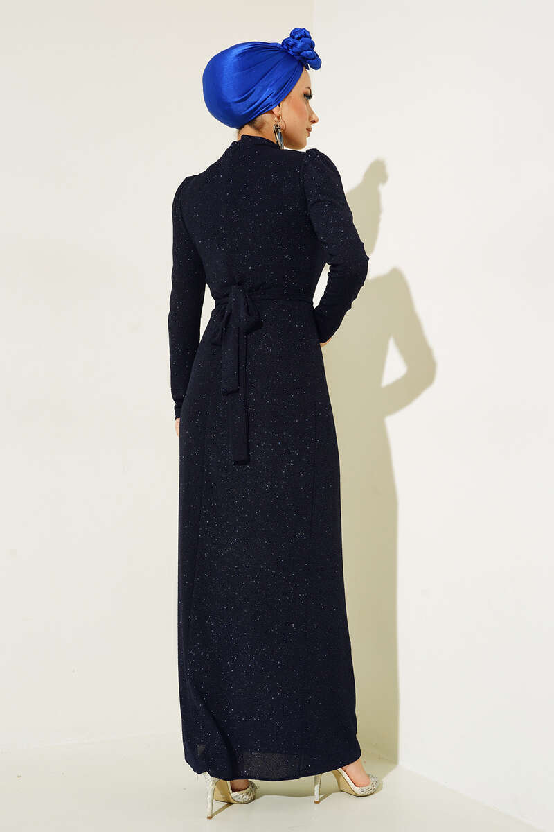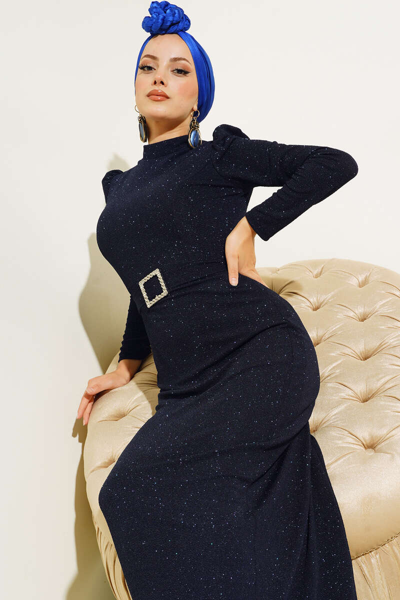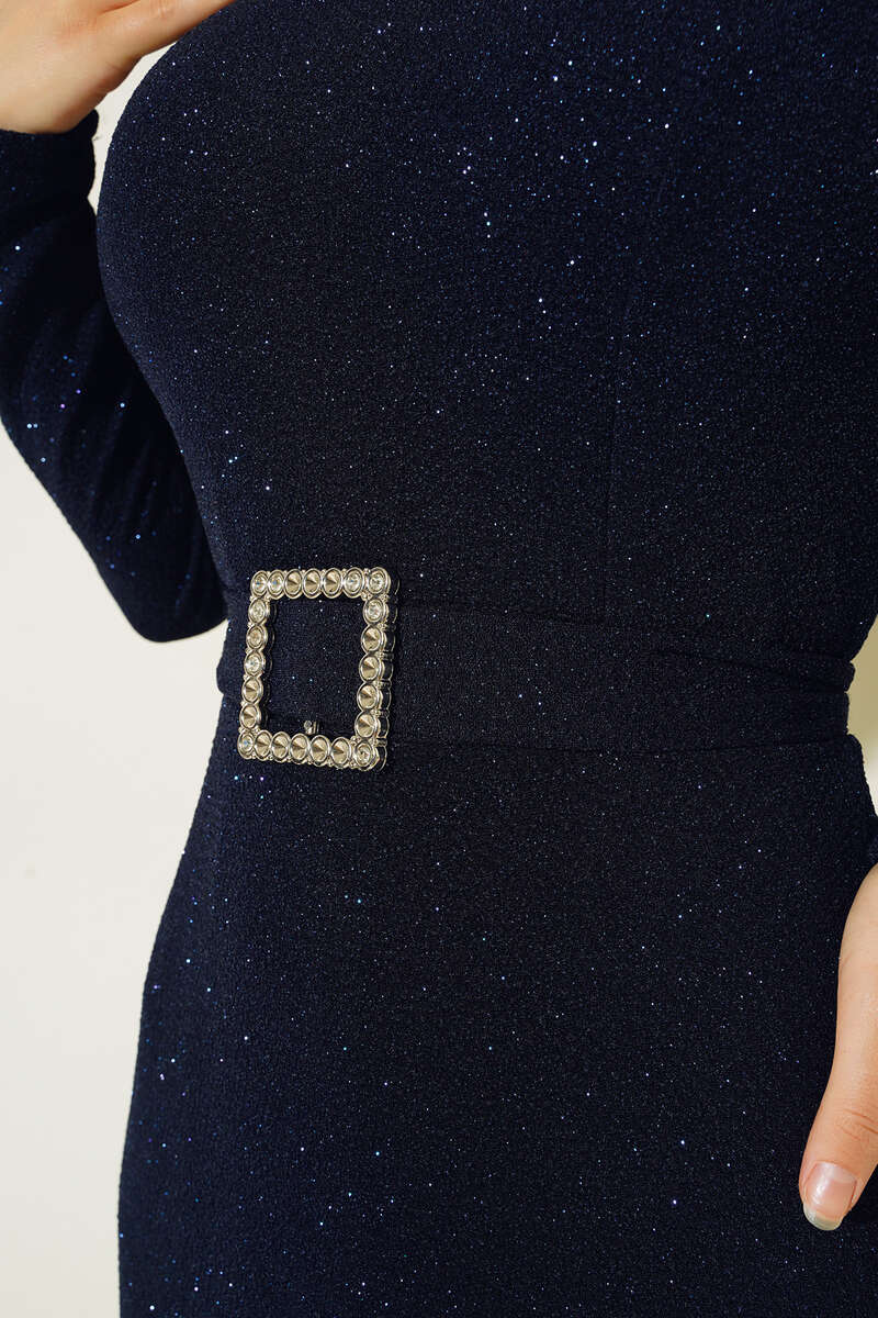 Yeni sezon abiye elbisemiz şıklığın ve zerafetin imzasını taşımaktadır. Sırt fermuarlı simli abiye elbisemiz hakim yakadır. Beli kuşaklı elbisemizin kuşağı kemer tokladır. Özel gün ve gecelerinizin vazgeçilmez kombini olacaktır.
