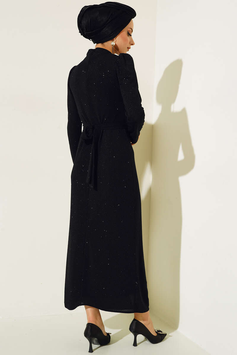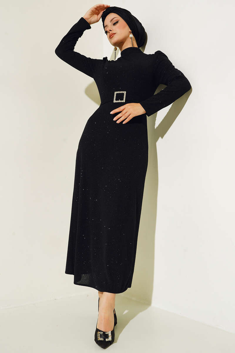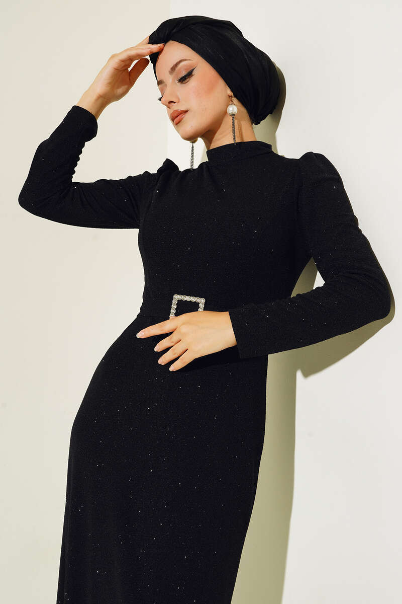 Yeni sezon abiye elbisemiz şıklığın ve zerafetin imzasını taşımaktadır. Sırt fermuarlı simli abiye elbisemiz hakim yakadır. Beli kuşaklı elbisemizin kuşağı kemer tokladır. Özel gün ve gecelerinizin vazgeçilmez kombini olacaktır.