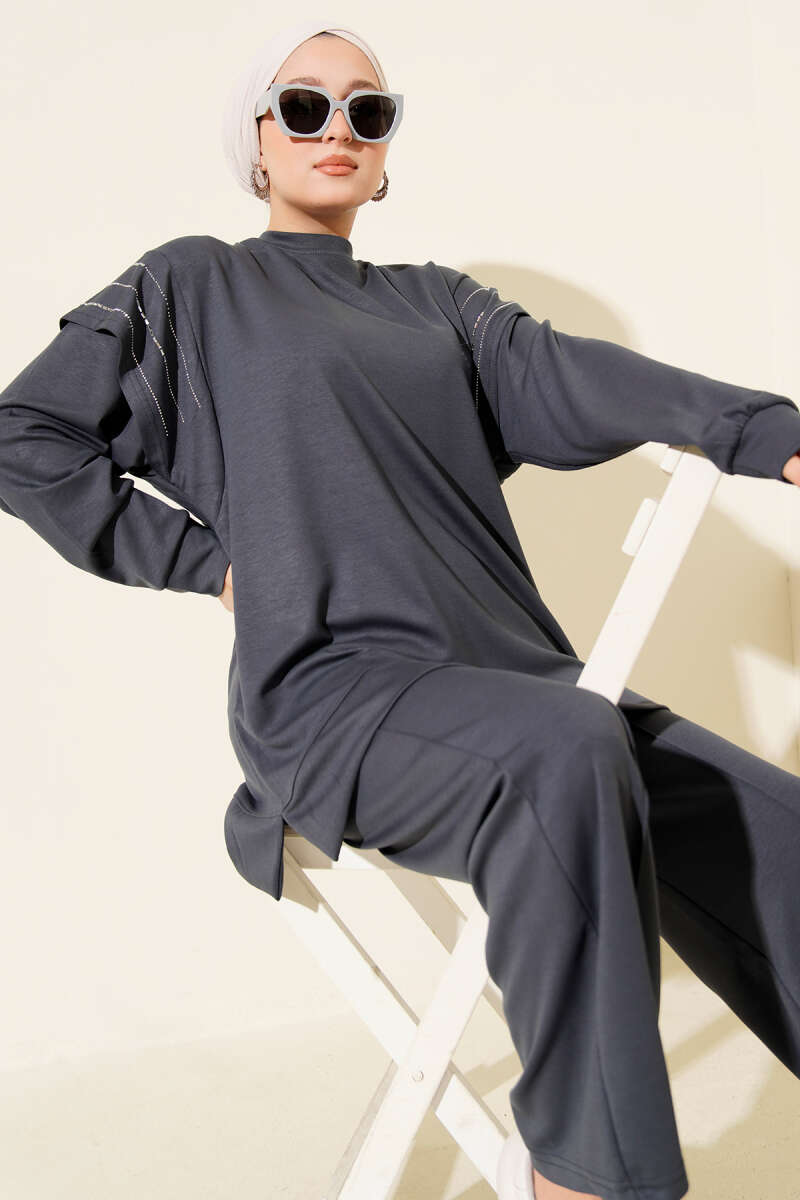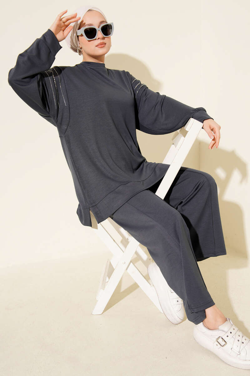 Fitilli Kol Kabartmalı Triko İkili Takım Taş