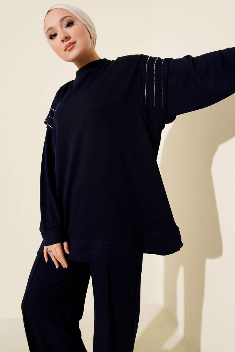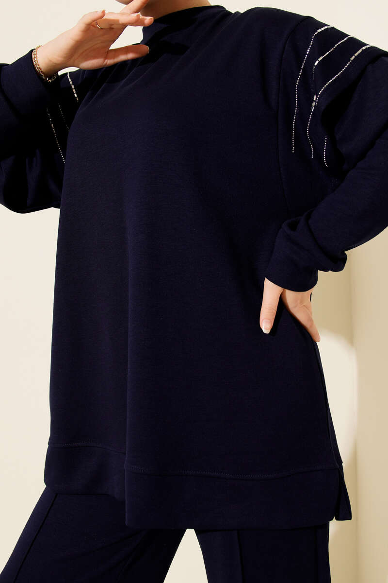 Tül Çiçekli İncili Triko İkili Takım Bej