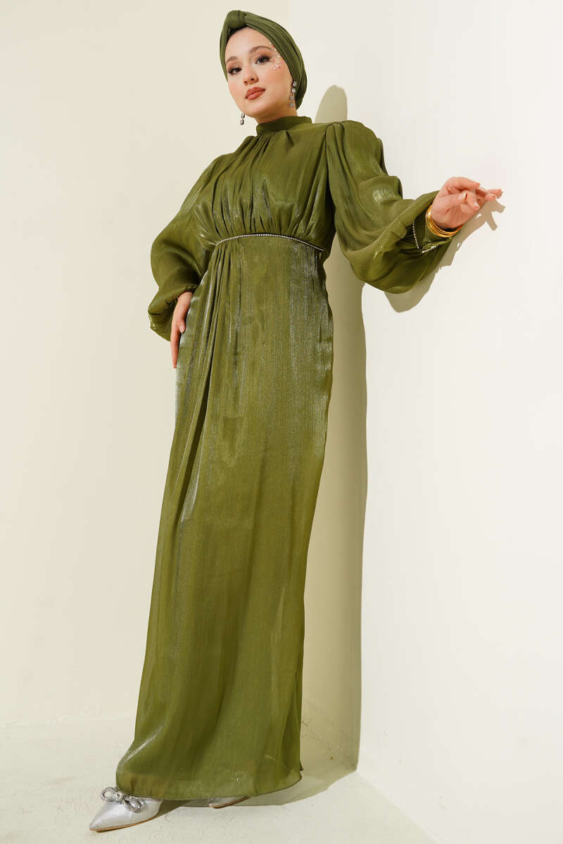 Sıra Taşlı Balon Kol Abiye Elbise Taş