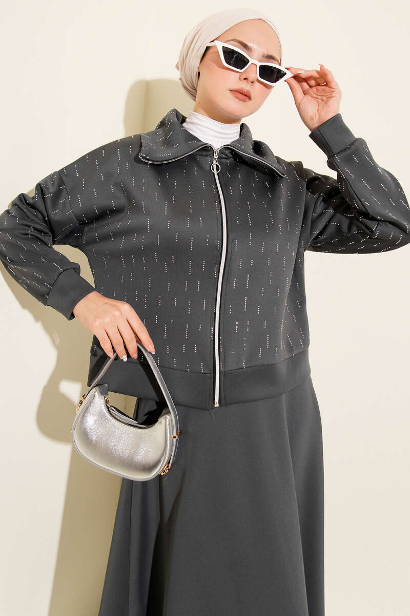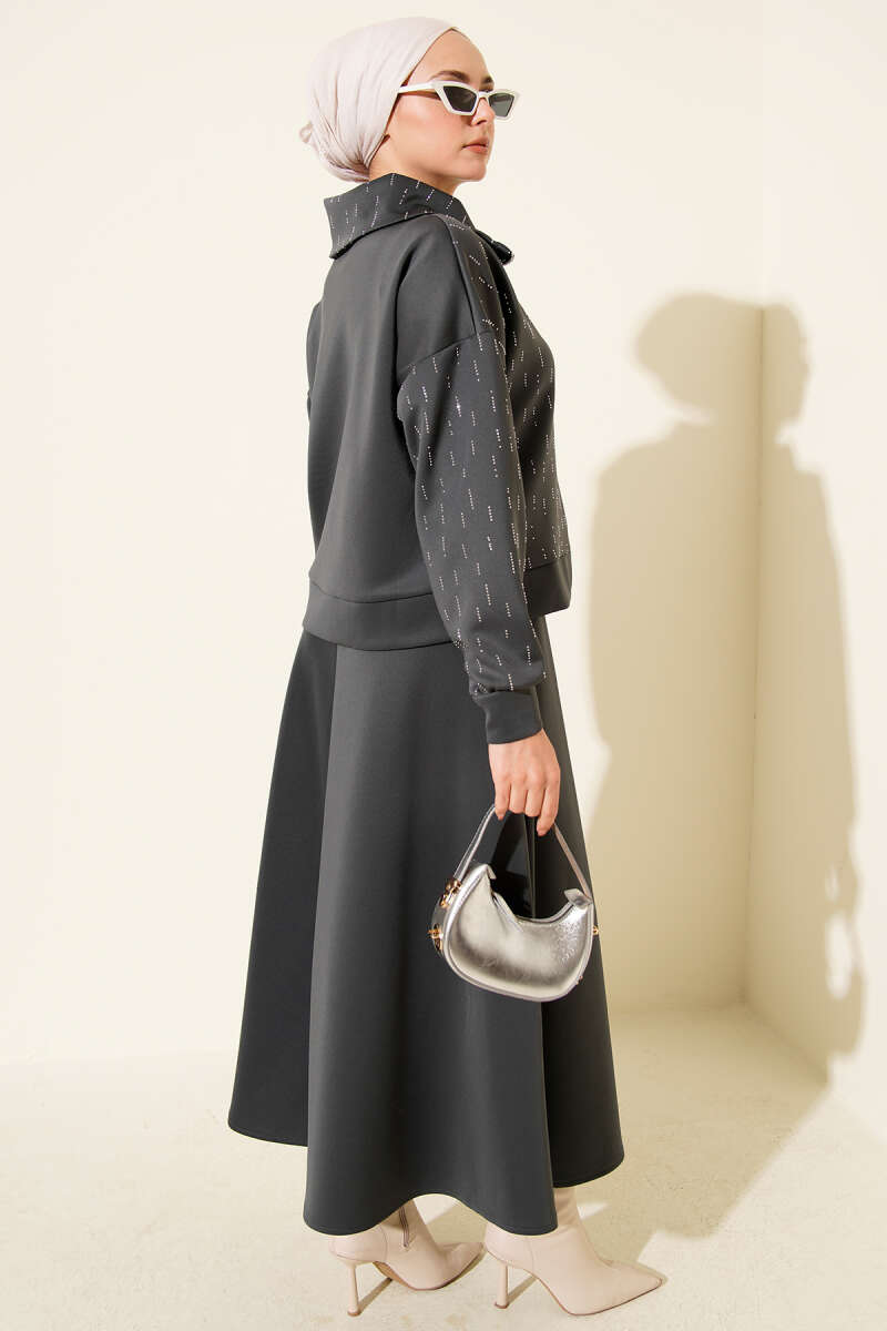 Kabartma Şeritli Taşlı Triko İkili Takım Nefti