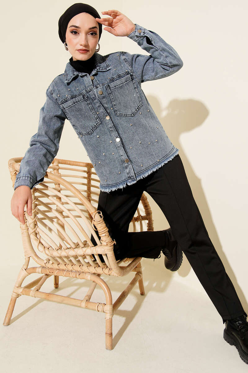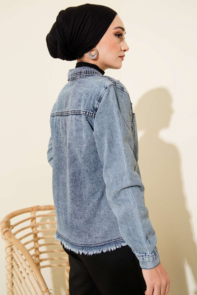 Sıra Taşlı Püsküllü Kısa Kot Ceket Kot Mavisi
