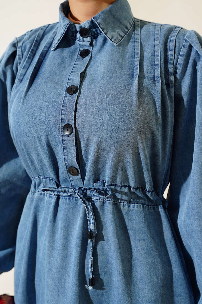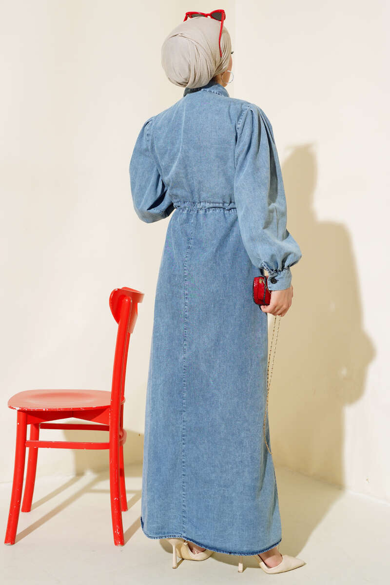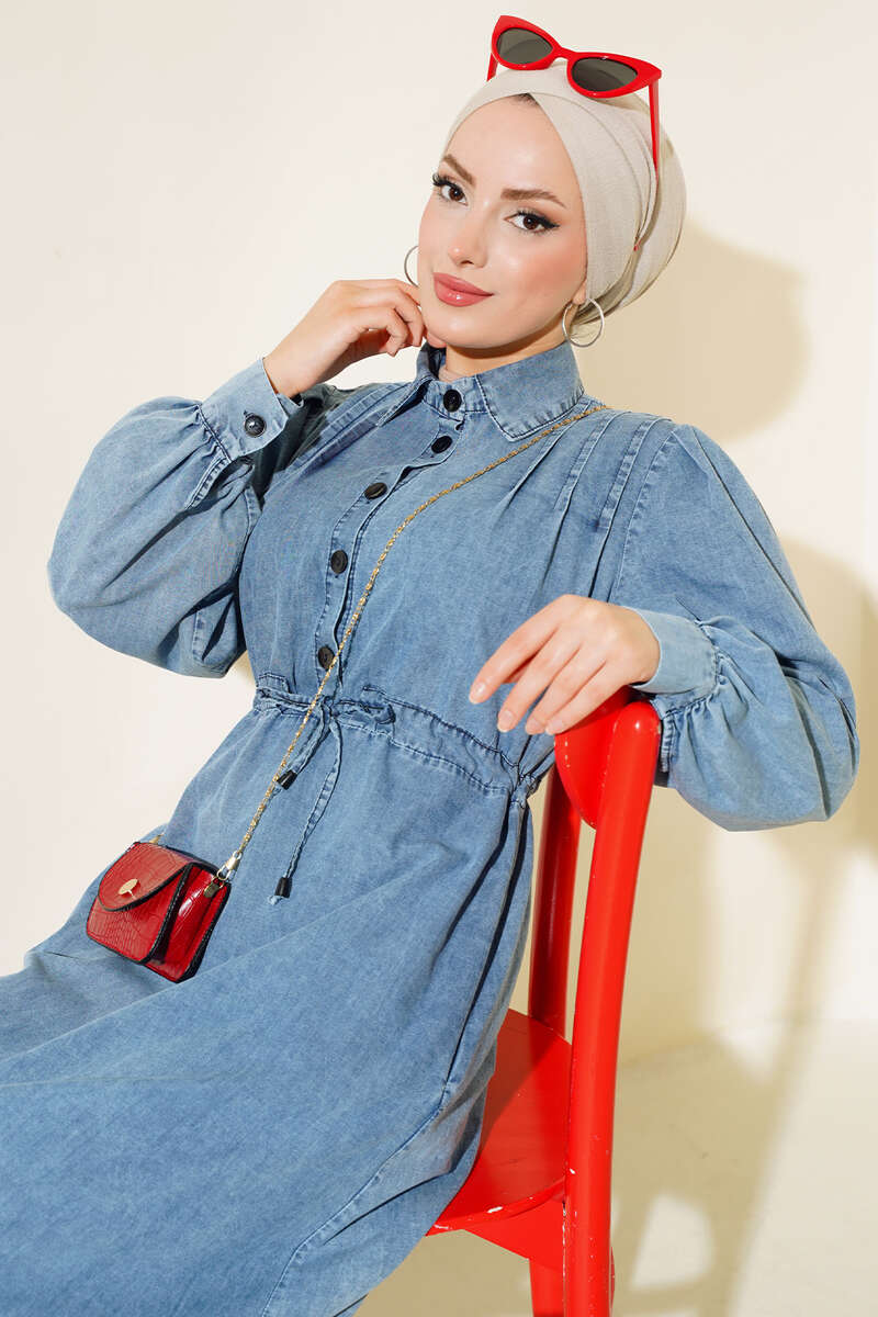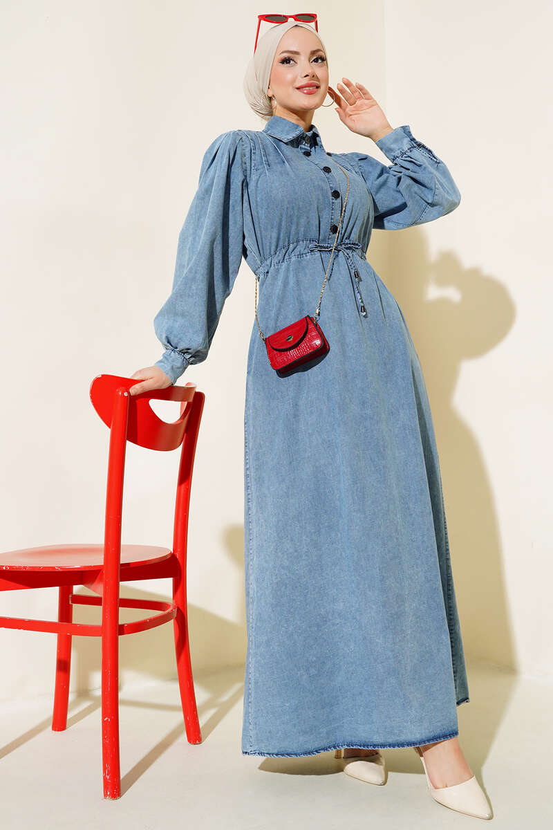 Yeni sezon elbise modelimiz sizlerle beraber. Önü yarıya kadar siyah düğmelidir. belden tünelli ip bağlamalıdır. Kol bilekleri düğmeli modeldir. Gömlek yaka modeldir. Kloş kot elbise modelimiz dolaplarınızda yerlerini beklemektedir.