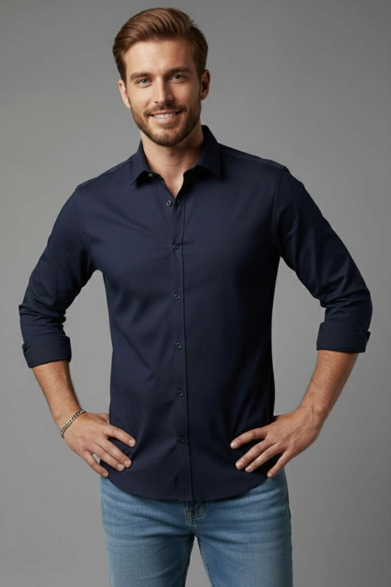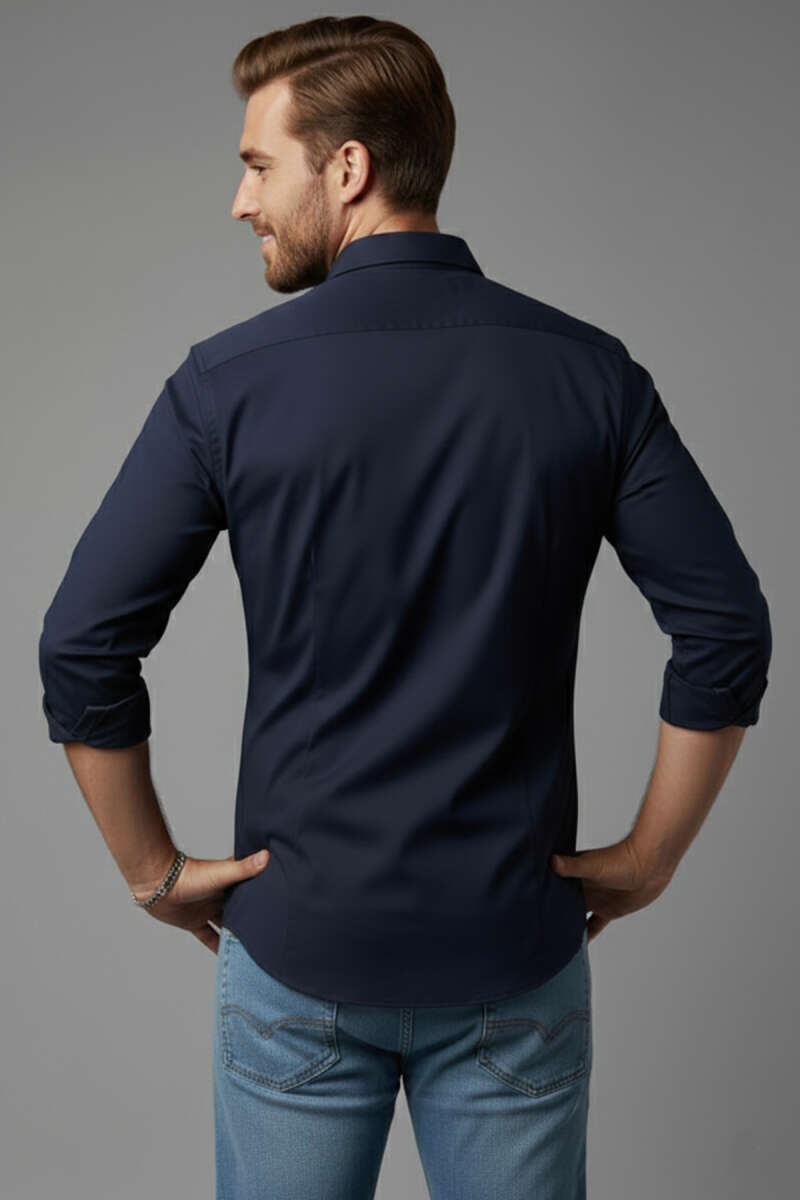 Slim Fit Pamuk Saten Erkek Gömlek Lacivert