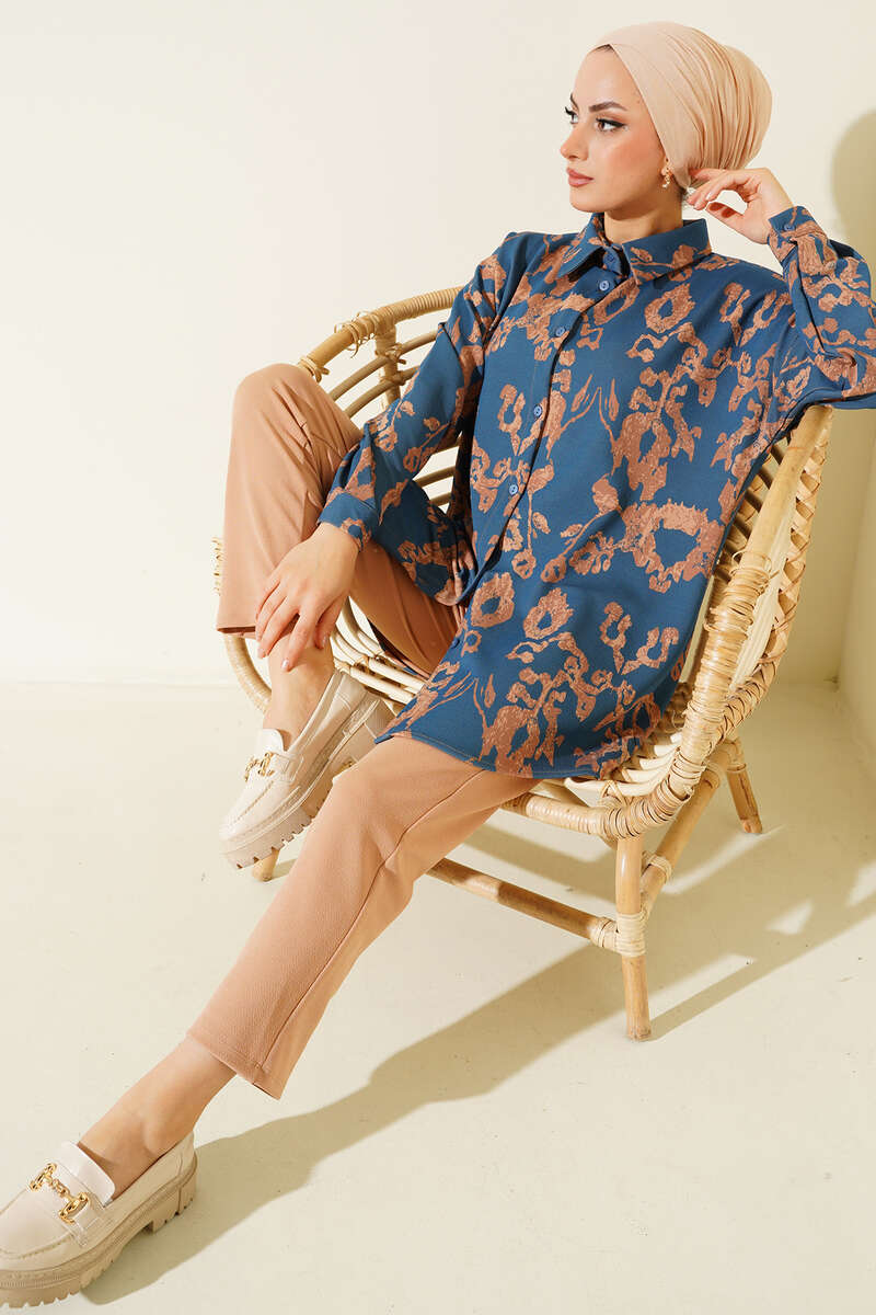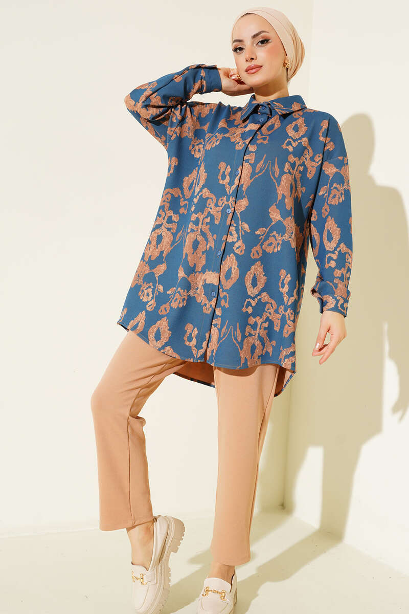 Yeni sezon takımımız pantolon ve tunik olmak üzere iki parçadan oluşmaktadır. Takımımız soluk çiçek desenlerine sahiptir. Klasik yakaya sahip olup boydan düğmelidir. Tuniğin etek kısmı oval kesime sahiptir. Pantolon beli lastikli ve cepsiz modeldir.