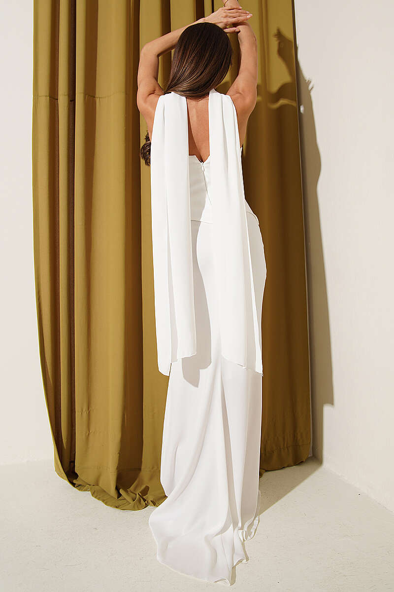 Straplez Yaka Şifon Abiye Elbise Ekru