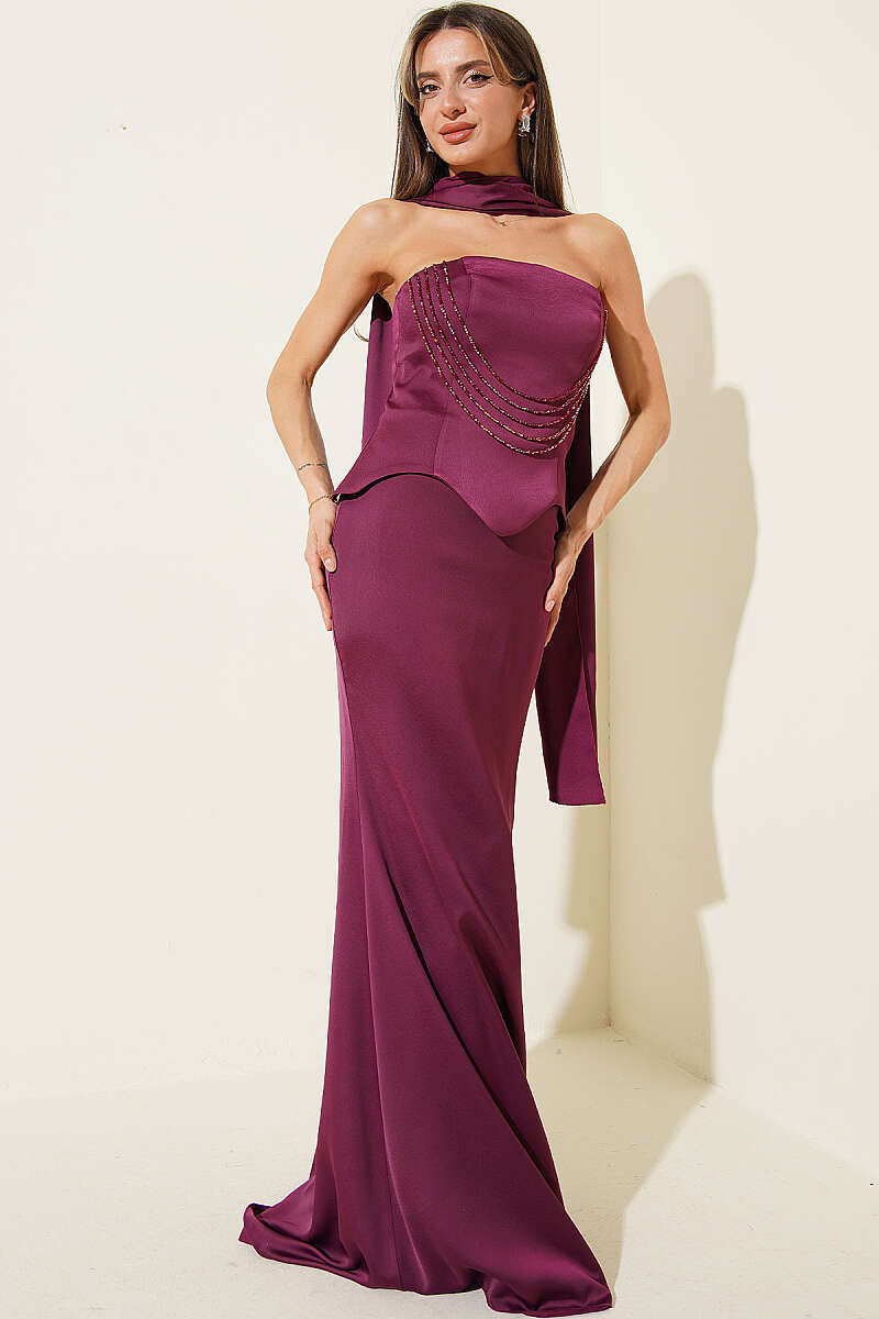 Straplez Önü Taşlı Abiye Elbise Mürdüm