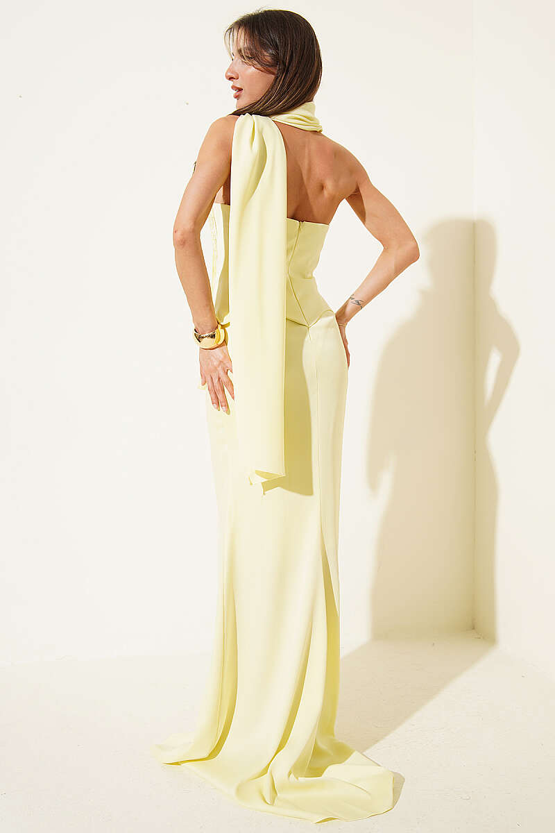 Straplez Önü Taşlı Abiye Elbise Sarı