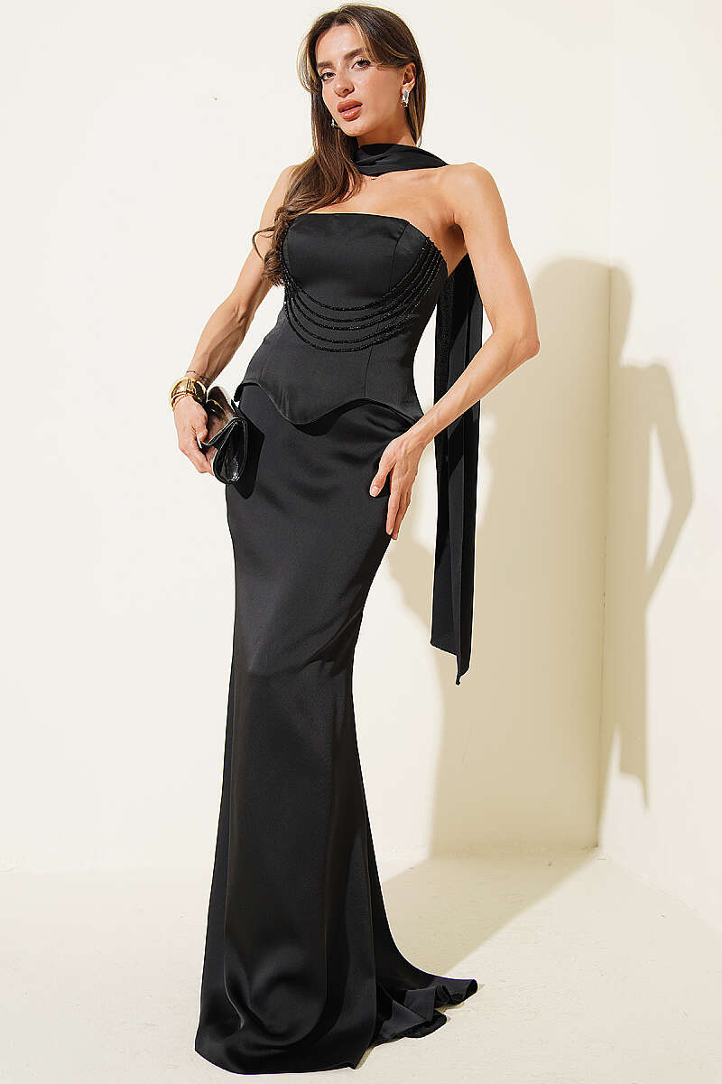 Straplez Önü Taşlı Abiye Elbise Siyah