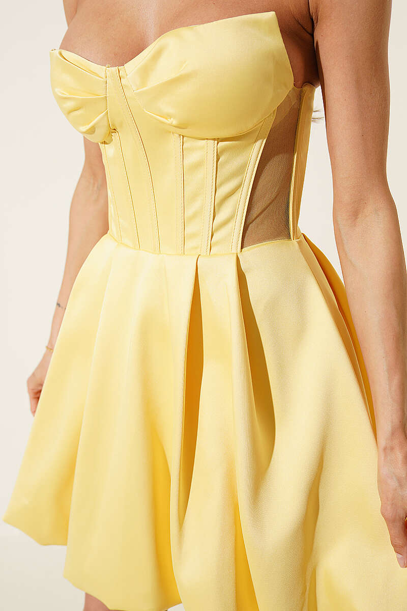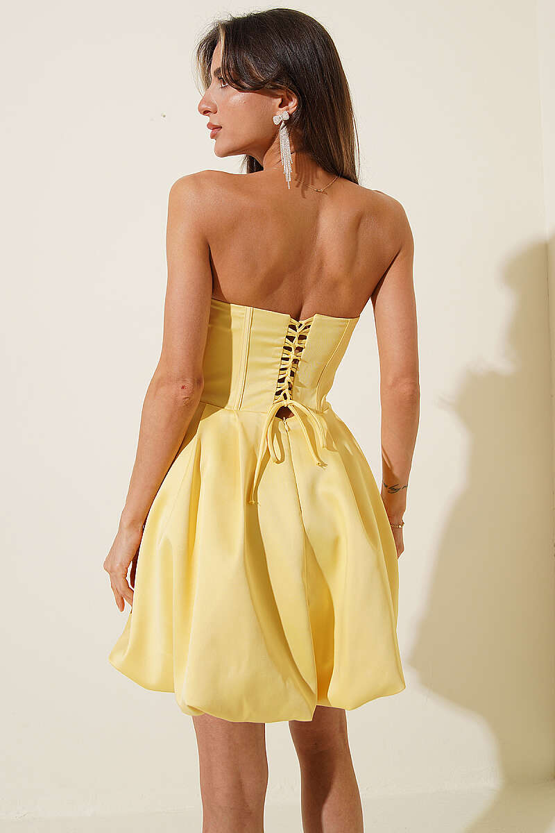 Straplez Yaka Mini Abiye Elbise Sarı