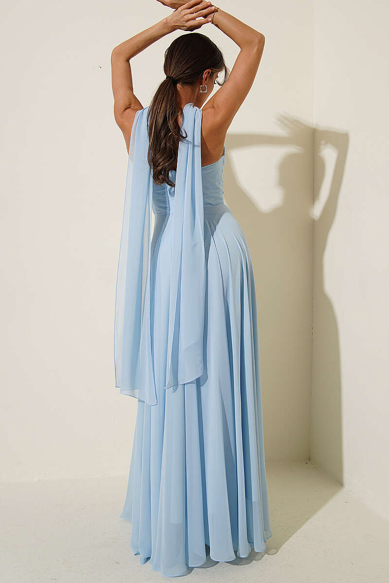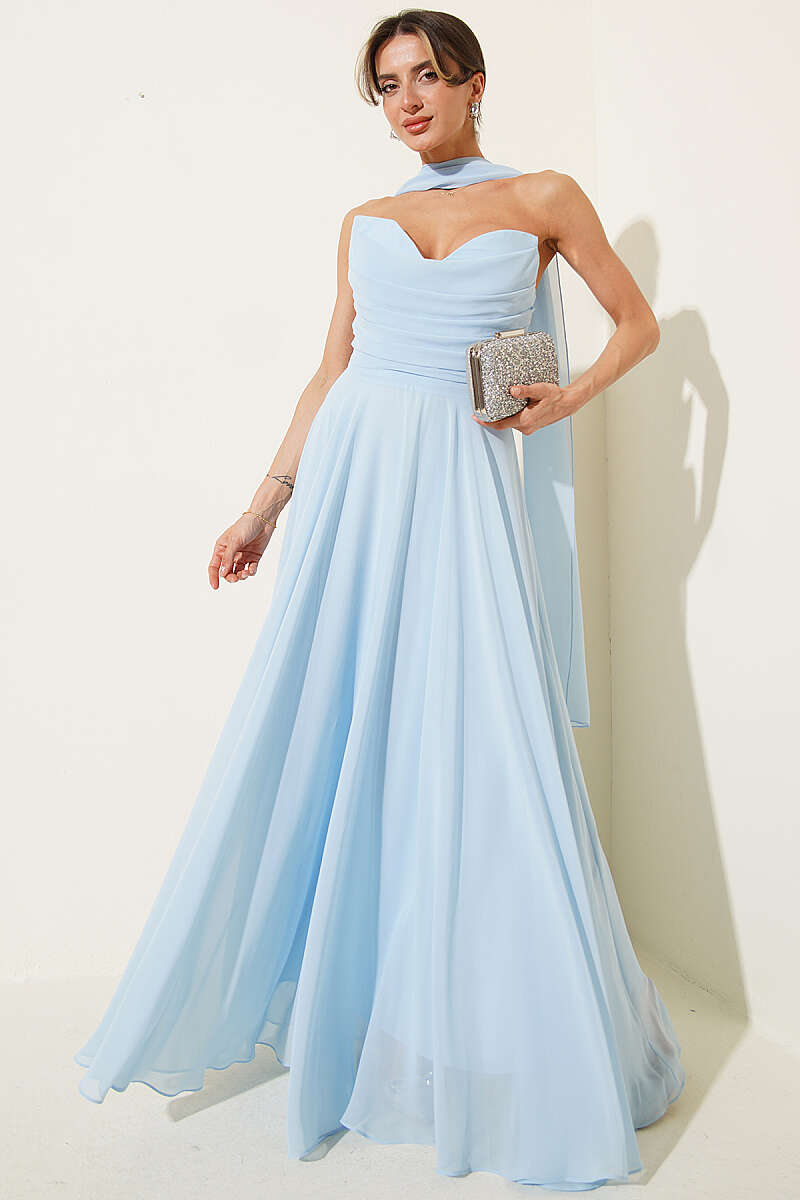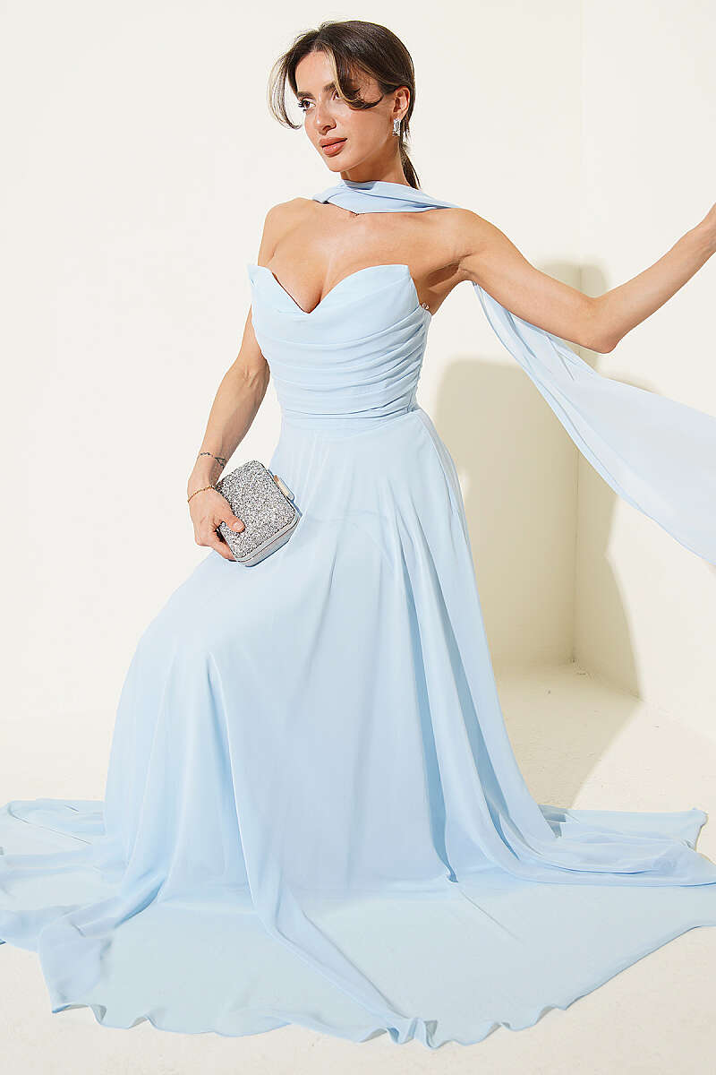 Straplez Yaka Şifon Abiye Elbise Bebe Mavi