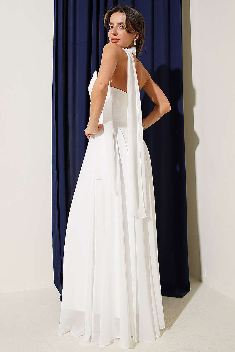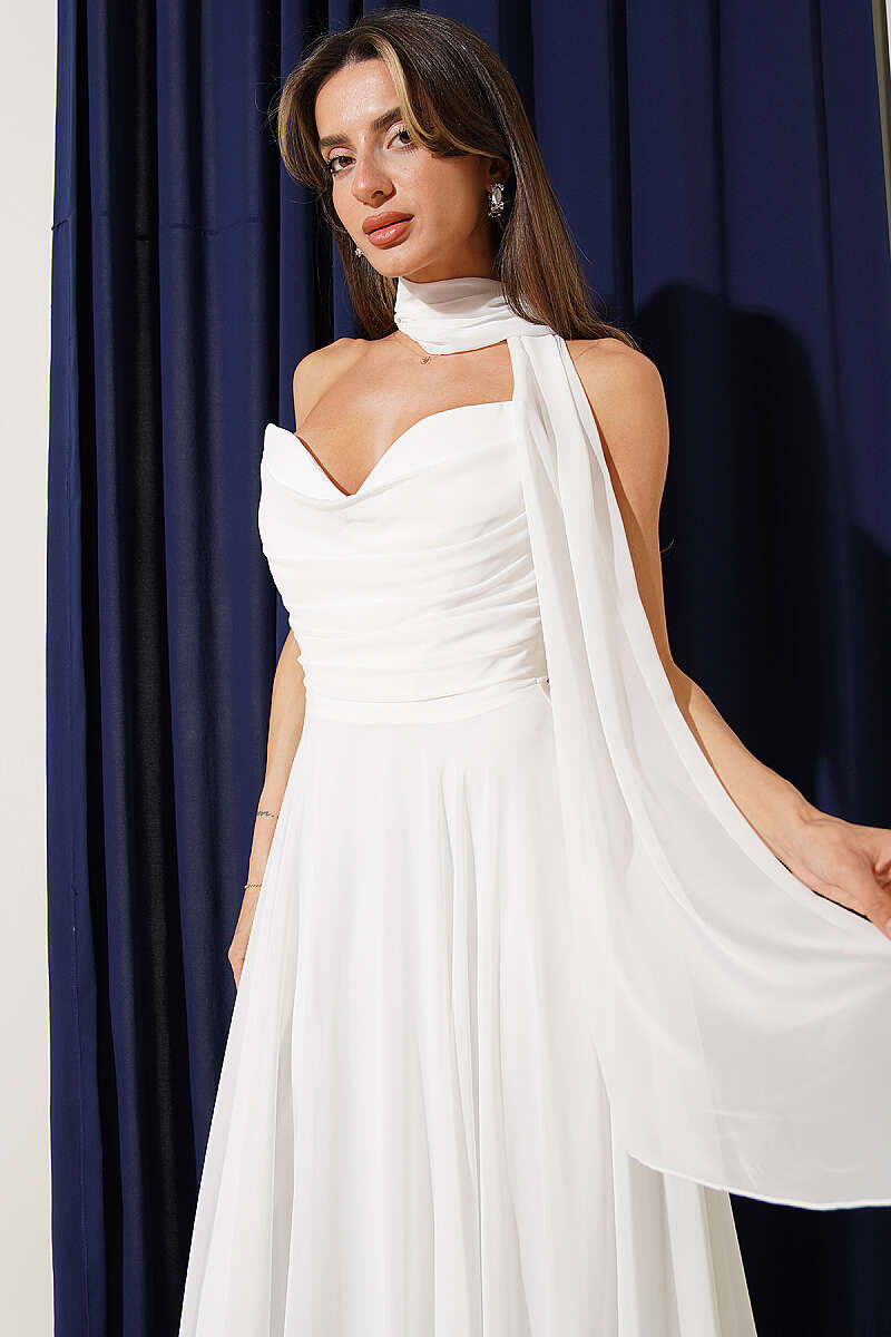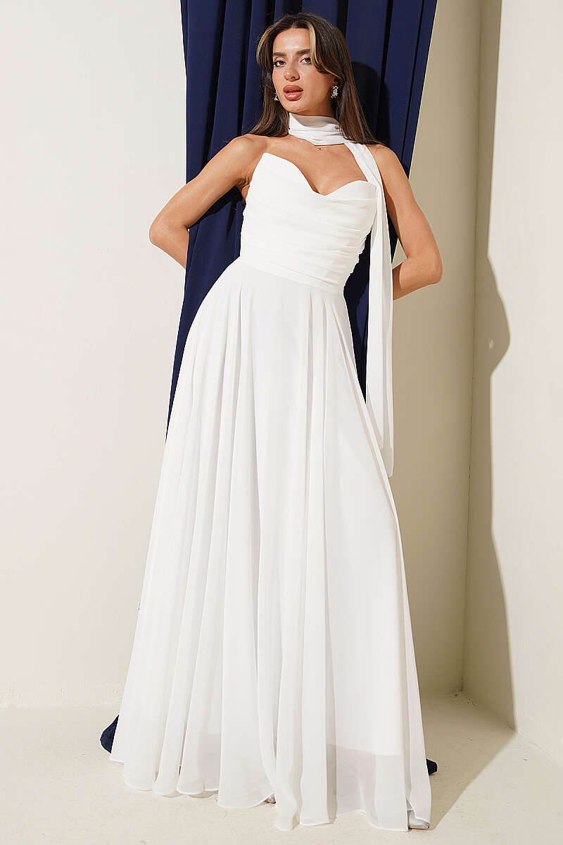 Straplez Yaka Şifon Abiye Elbise Ekru