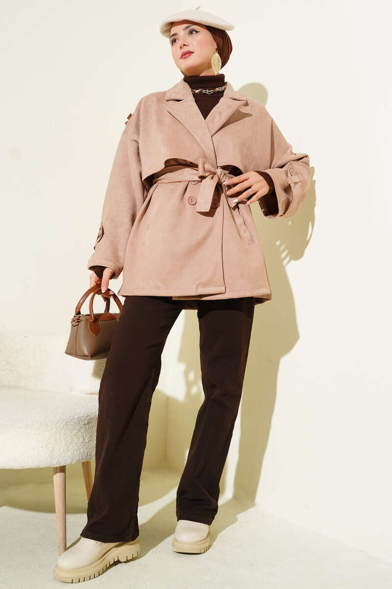 Süet Pelerinli Kuşaklı Trençkot Bej