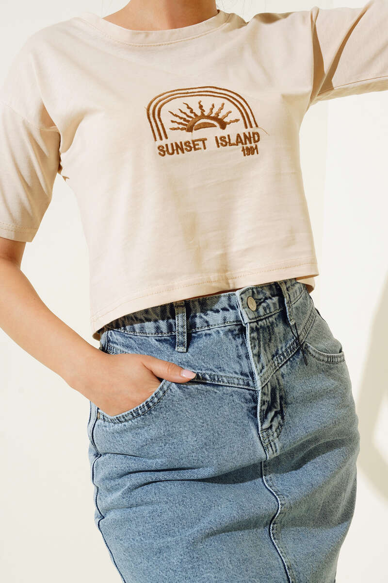 Yeni sezon crop tshirt önünde bulunan nakış detayıyla dikkat çekmektedir. Sunset island ve güneş nakışlı crop tshirt bisiklet yakadır. Crop tshirt sportif kombinlerinizin vazgeçilmez tamamlayıcısı olacaktır.