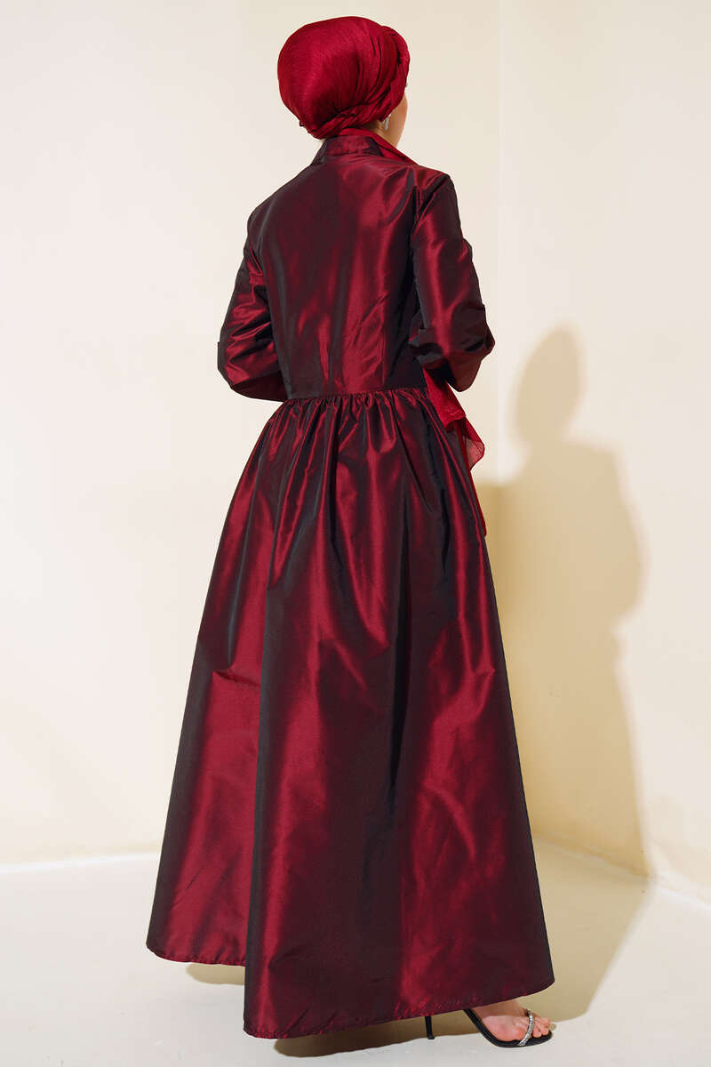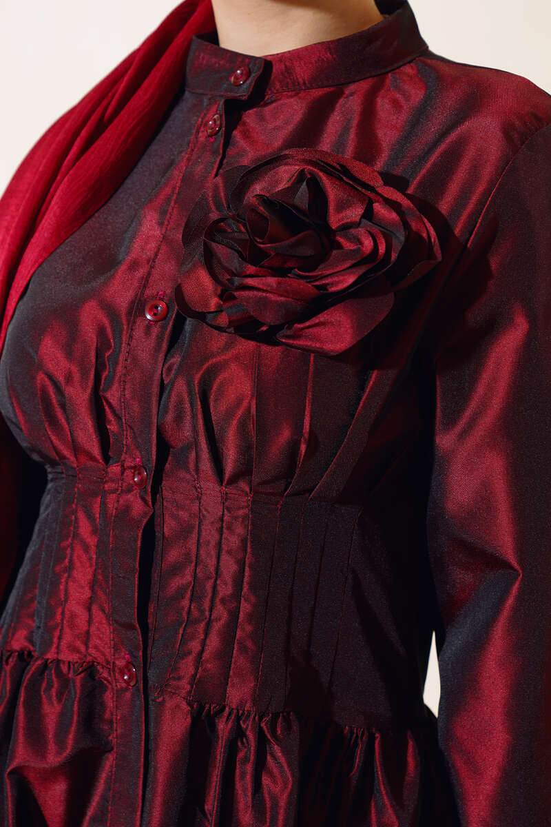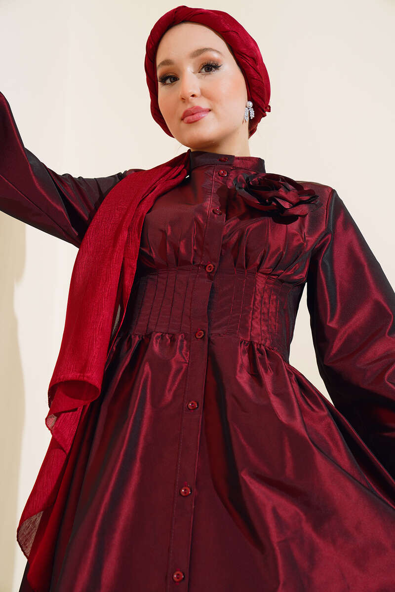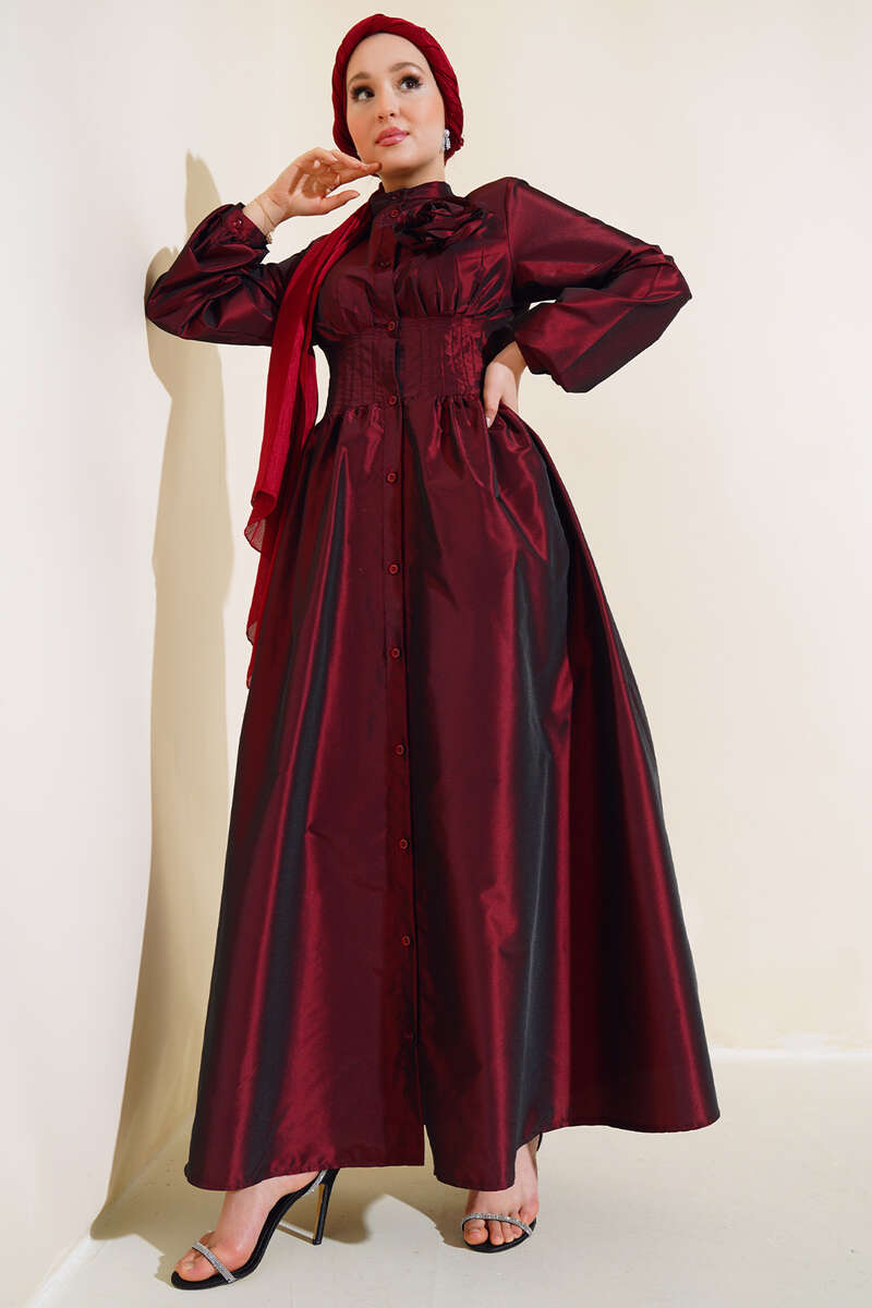 Yeni sezon elbisemiz şık tarzıyla sizlerle beraber. Gül aksesuarlı elbisemiz şık tarzıyla sizleri hayran bırakacak. Tafta elbisemiz kloş modeldir. Önü boydan düğmelidir. Kol bilekleri de düğmelidir. Şık tasarımı ile özel günlerinizin başrolü olacaksınız.