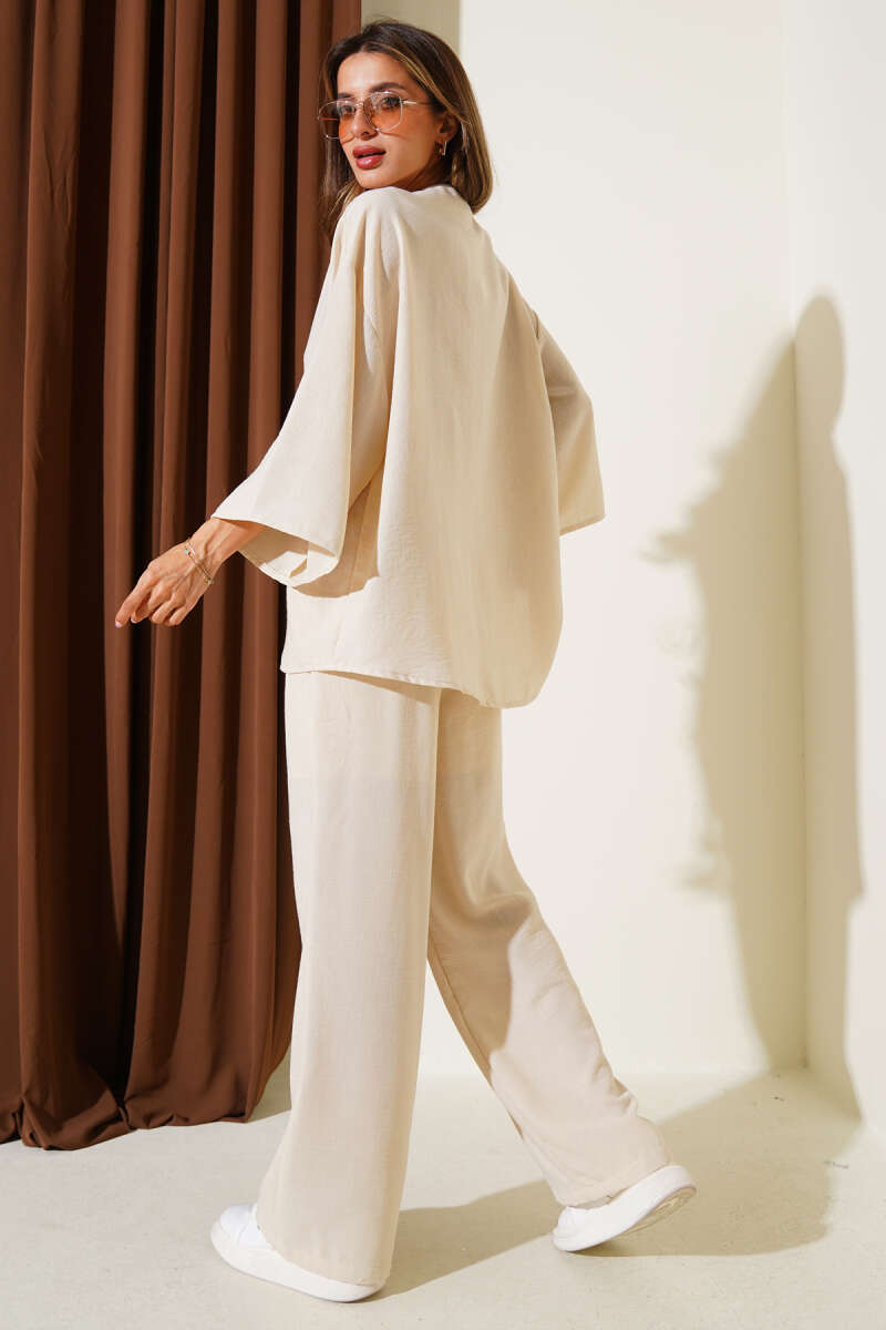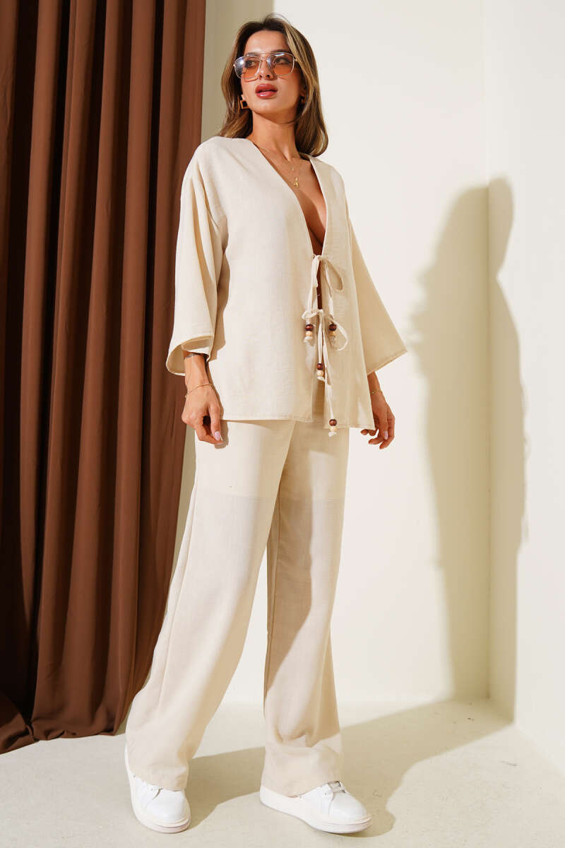 Brit Düğme Detaylı İp Kuşaklı İkili Takım Kahve
