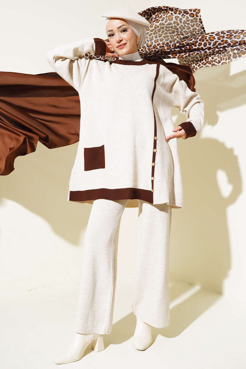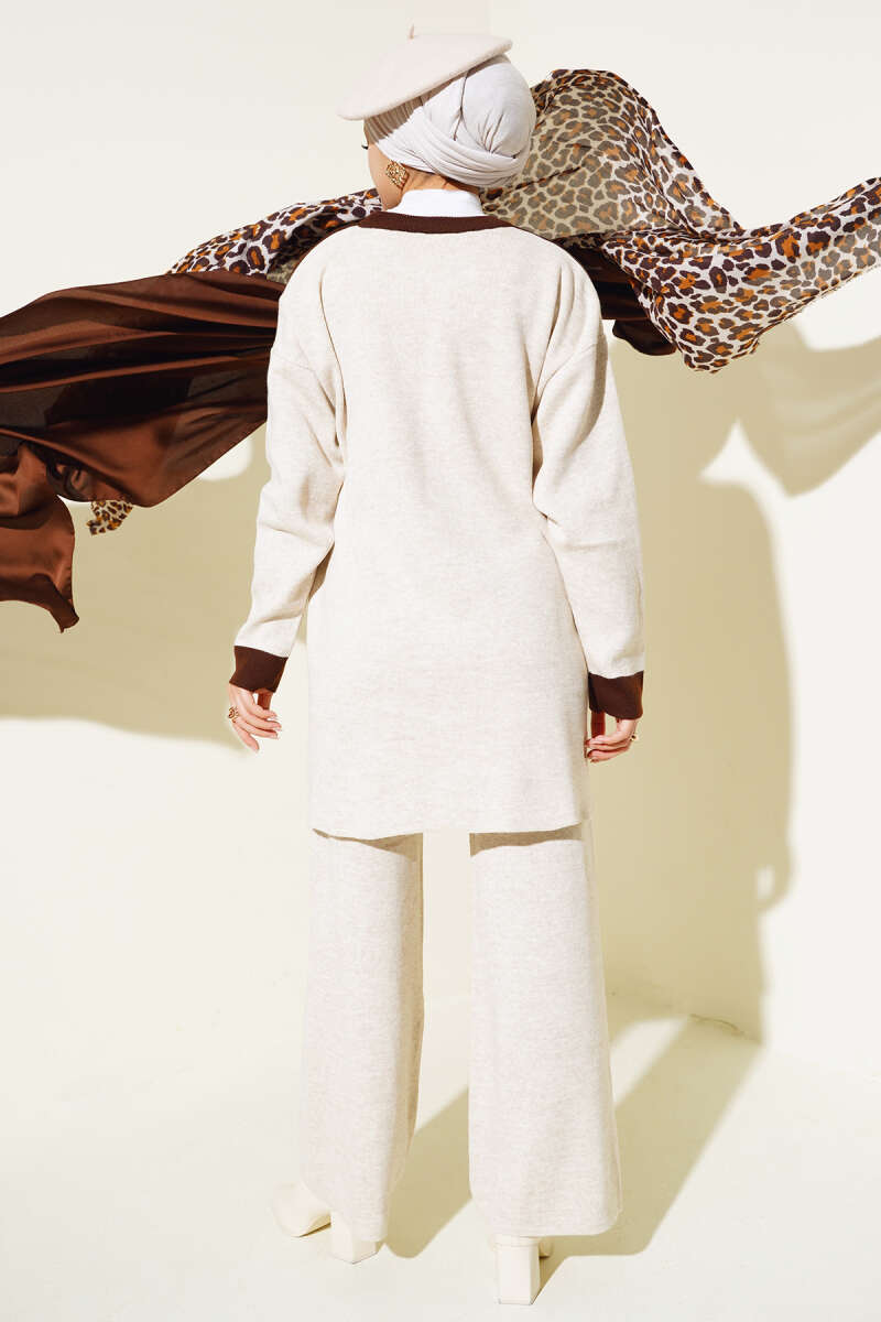 Tahta Düğme Detaylı Triko İkili Takım Bej