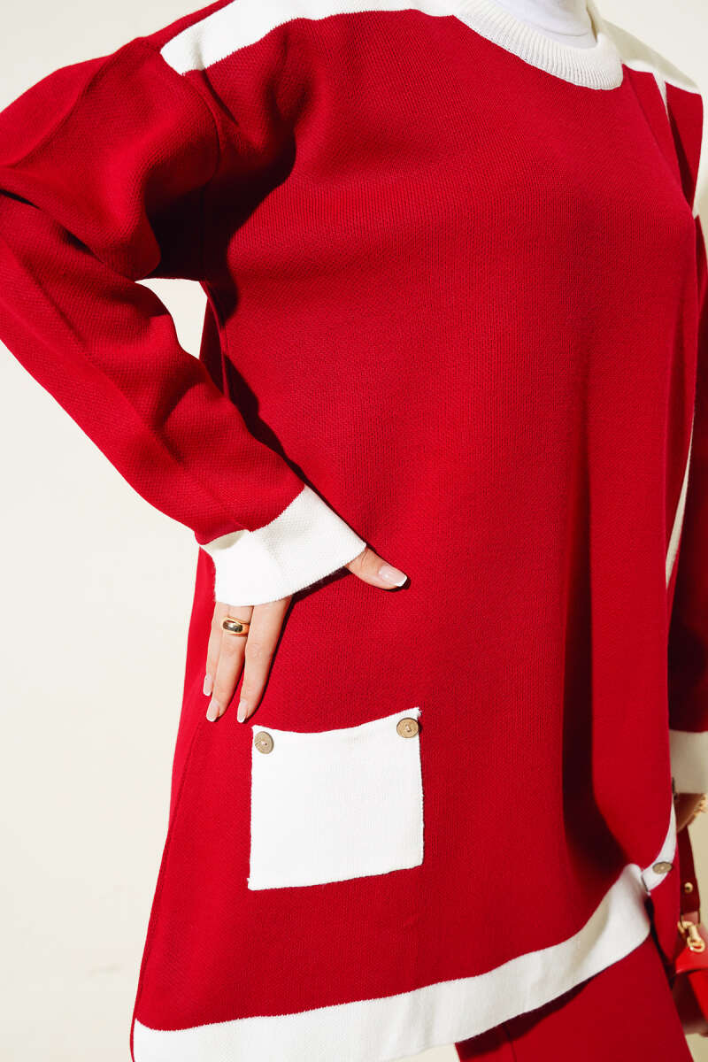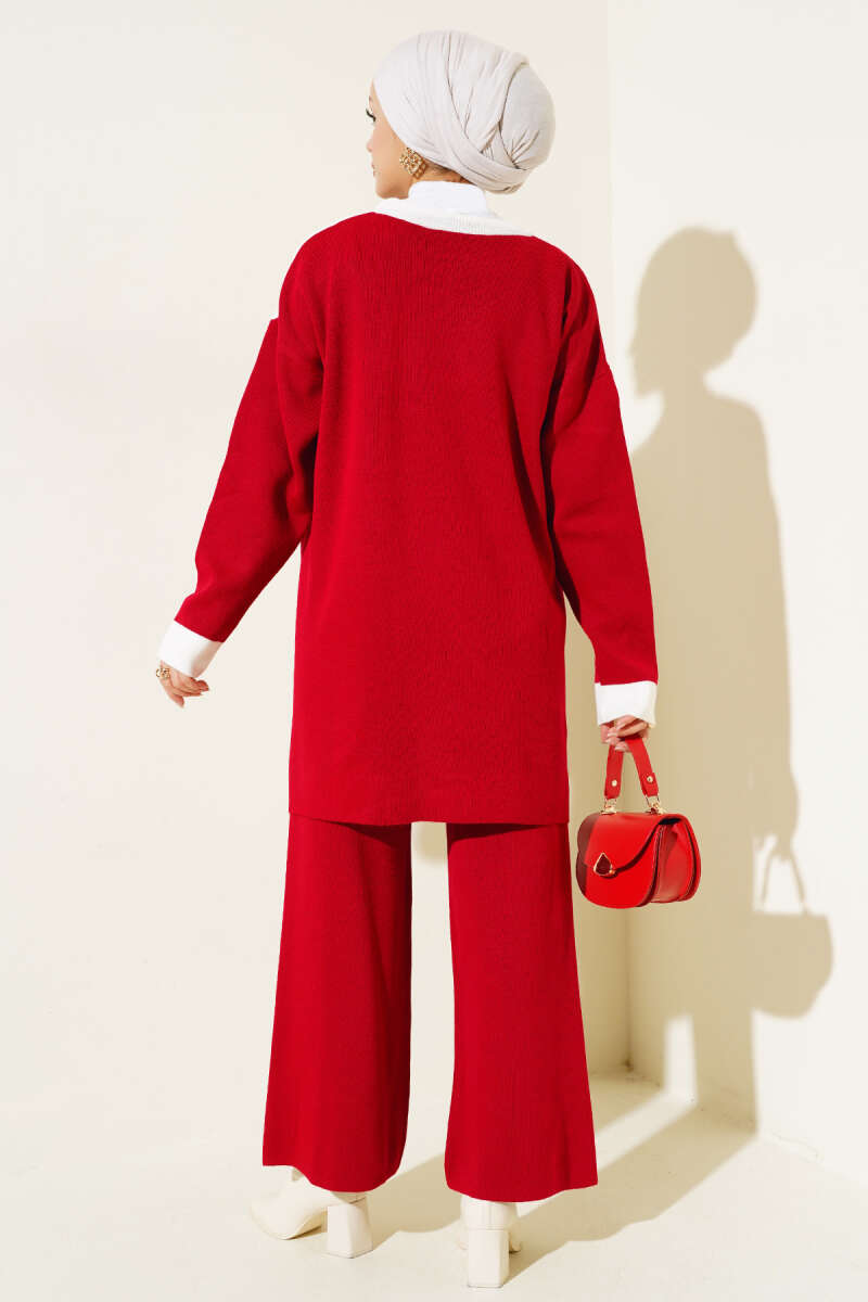 Tahta Düğme Detaylı Triko İkili Takım Kırmızı