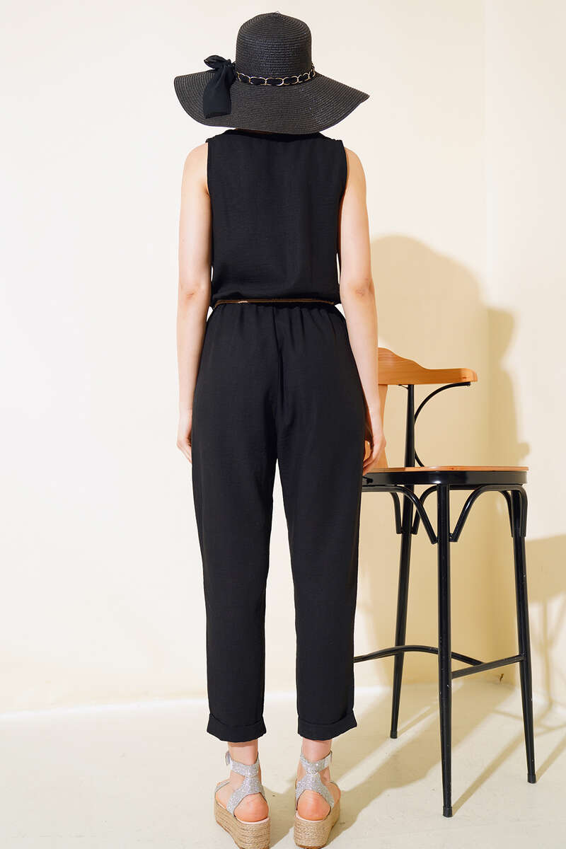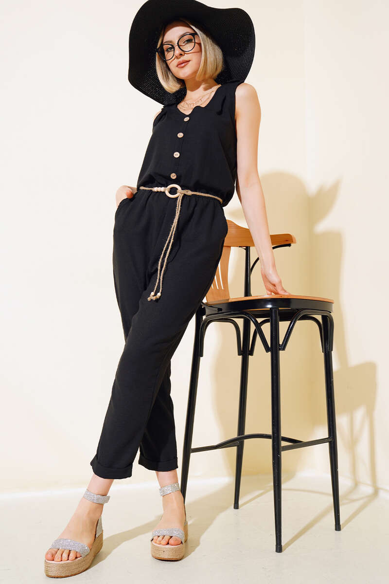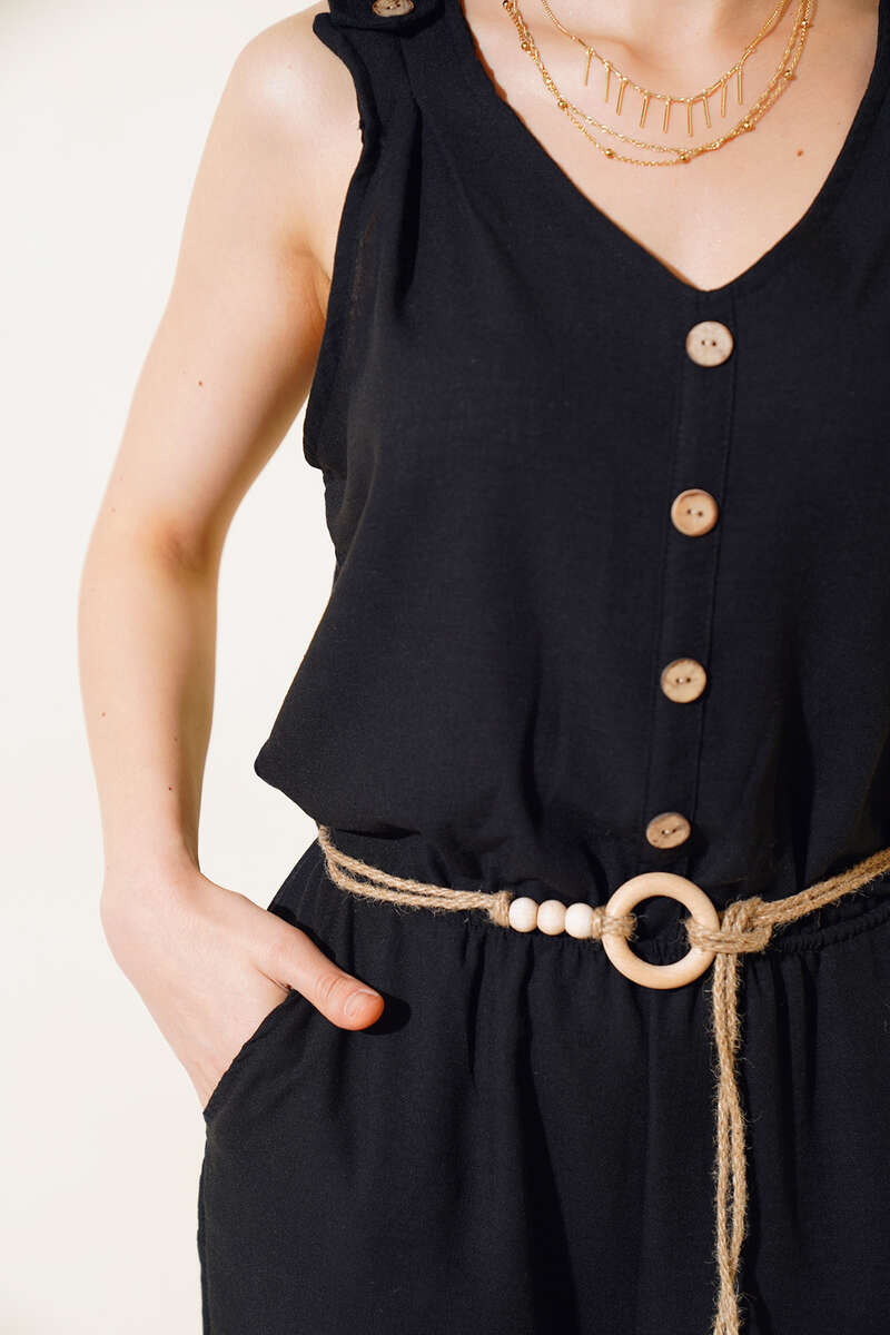 Tahta Düğmeli Keten Tulum Siyah