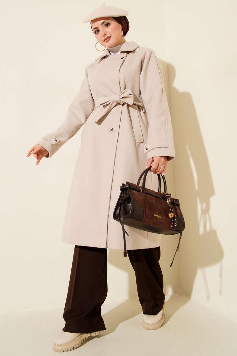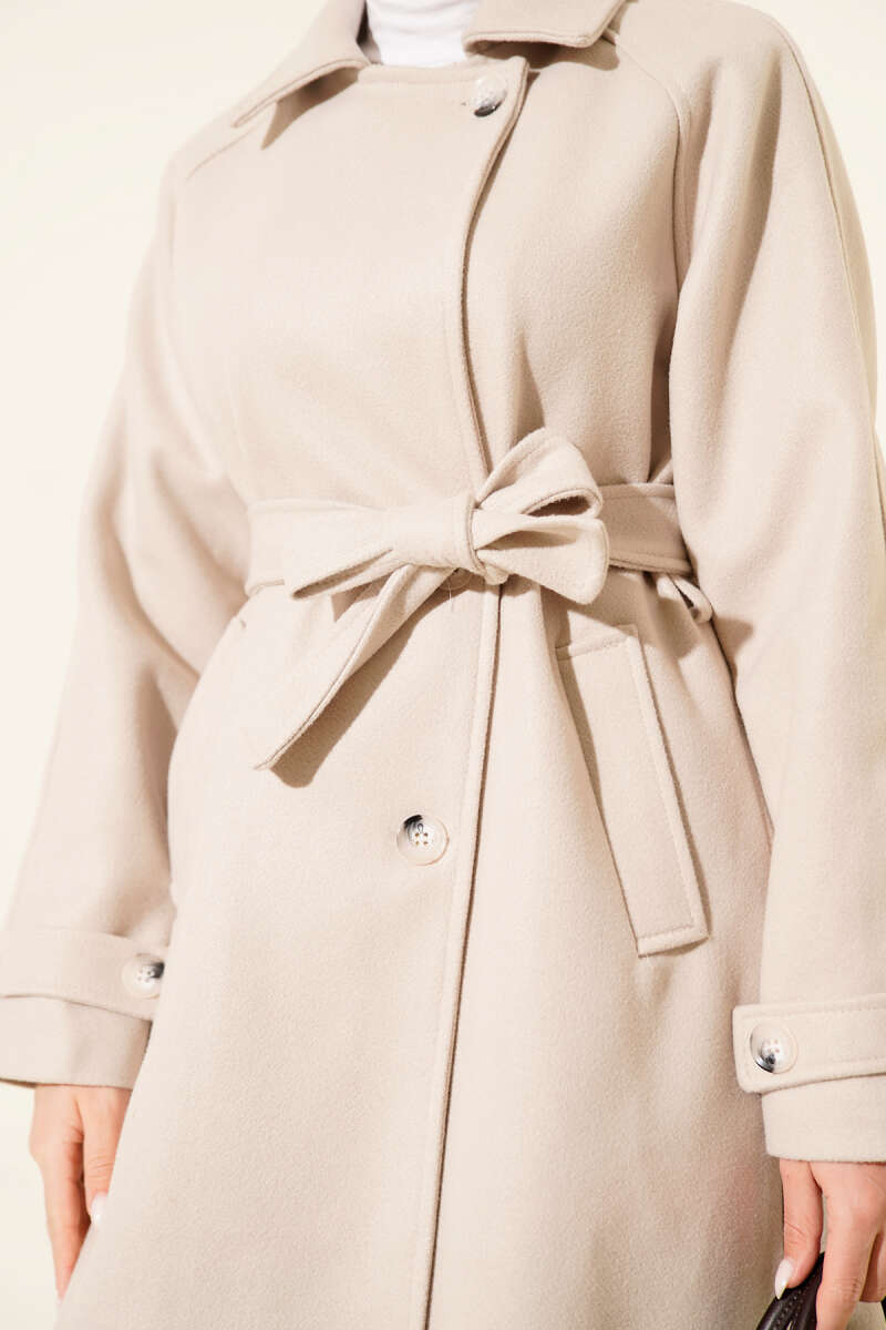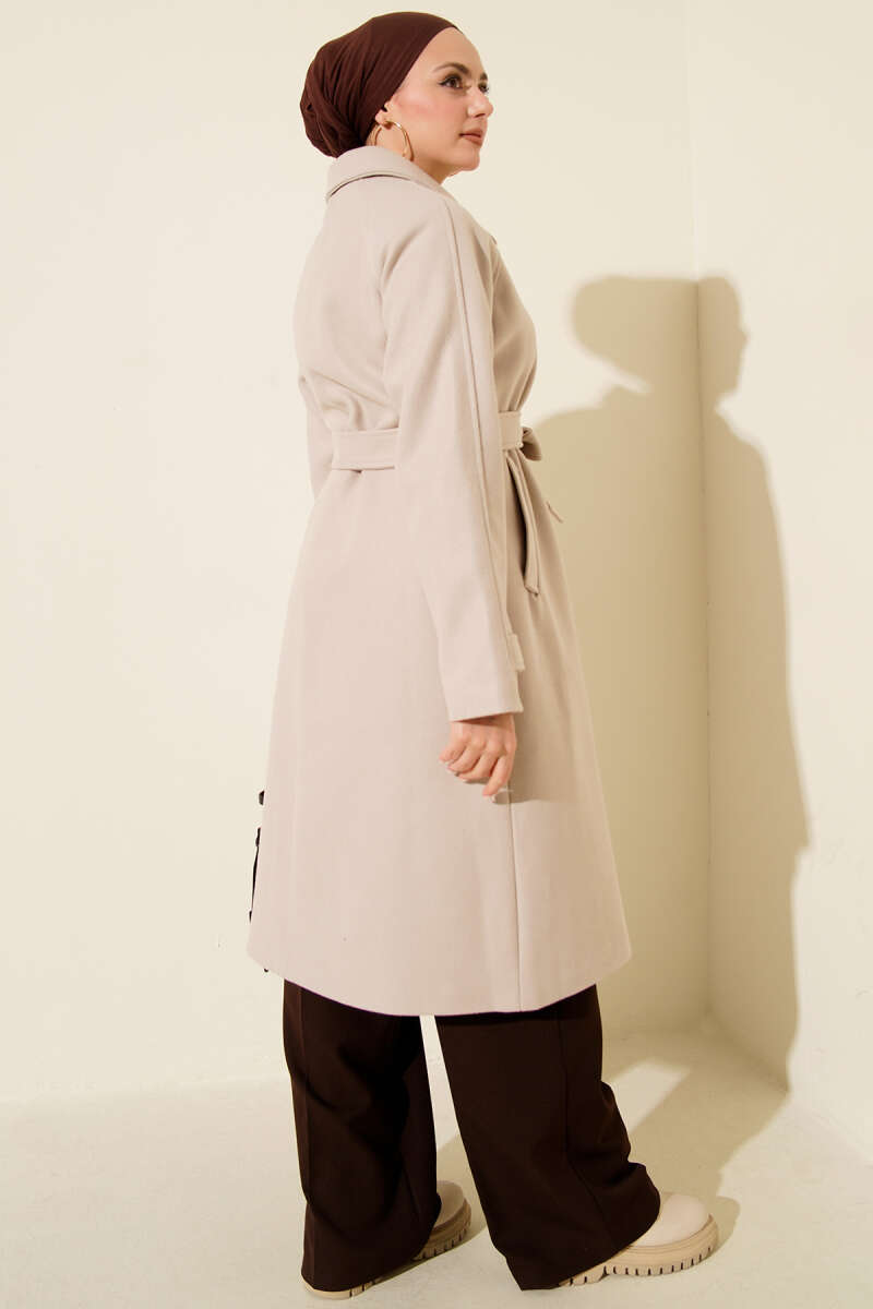 Bel Kuşaklı Düğmeli Trençkot Taş