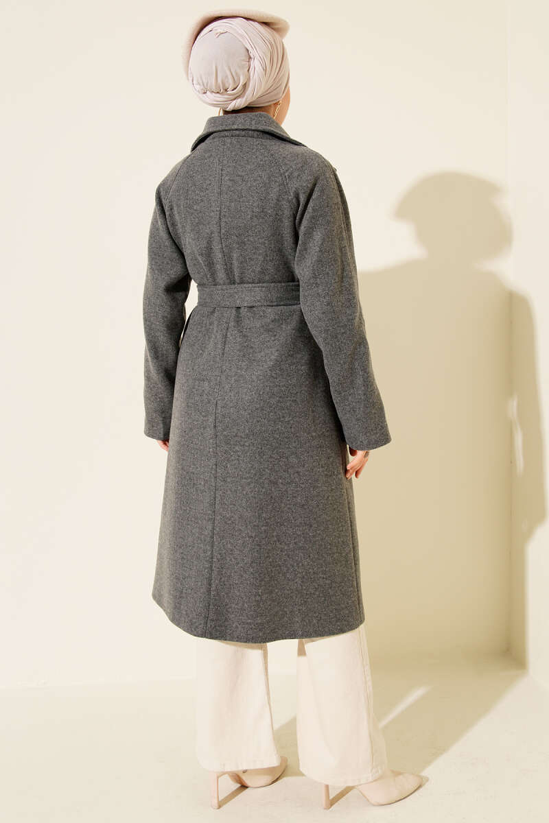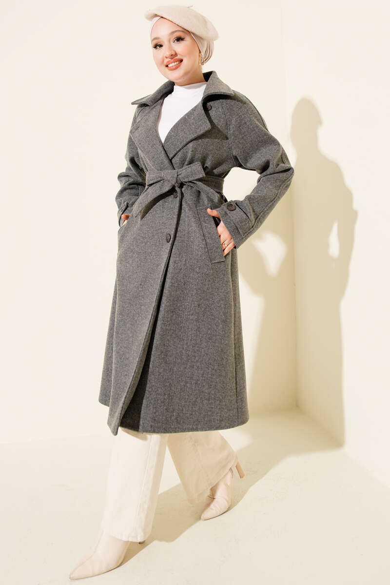 Bebe Yaka Kuşaklı Kaşe Kaban Gri