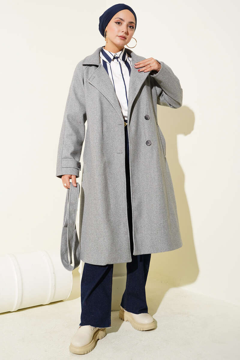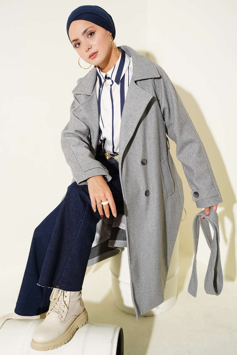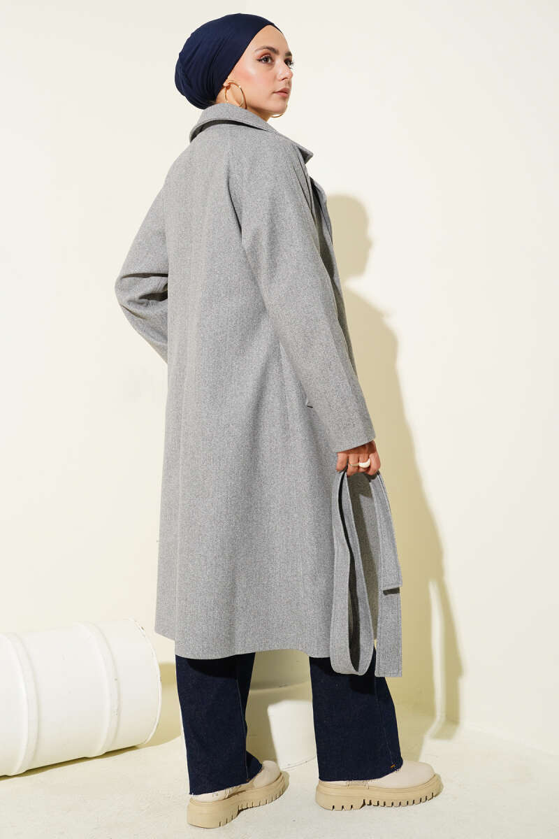 Yaka Düğmeli Kuşaklı Kaşe Kaban Gri