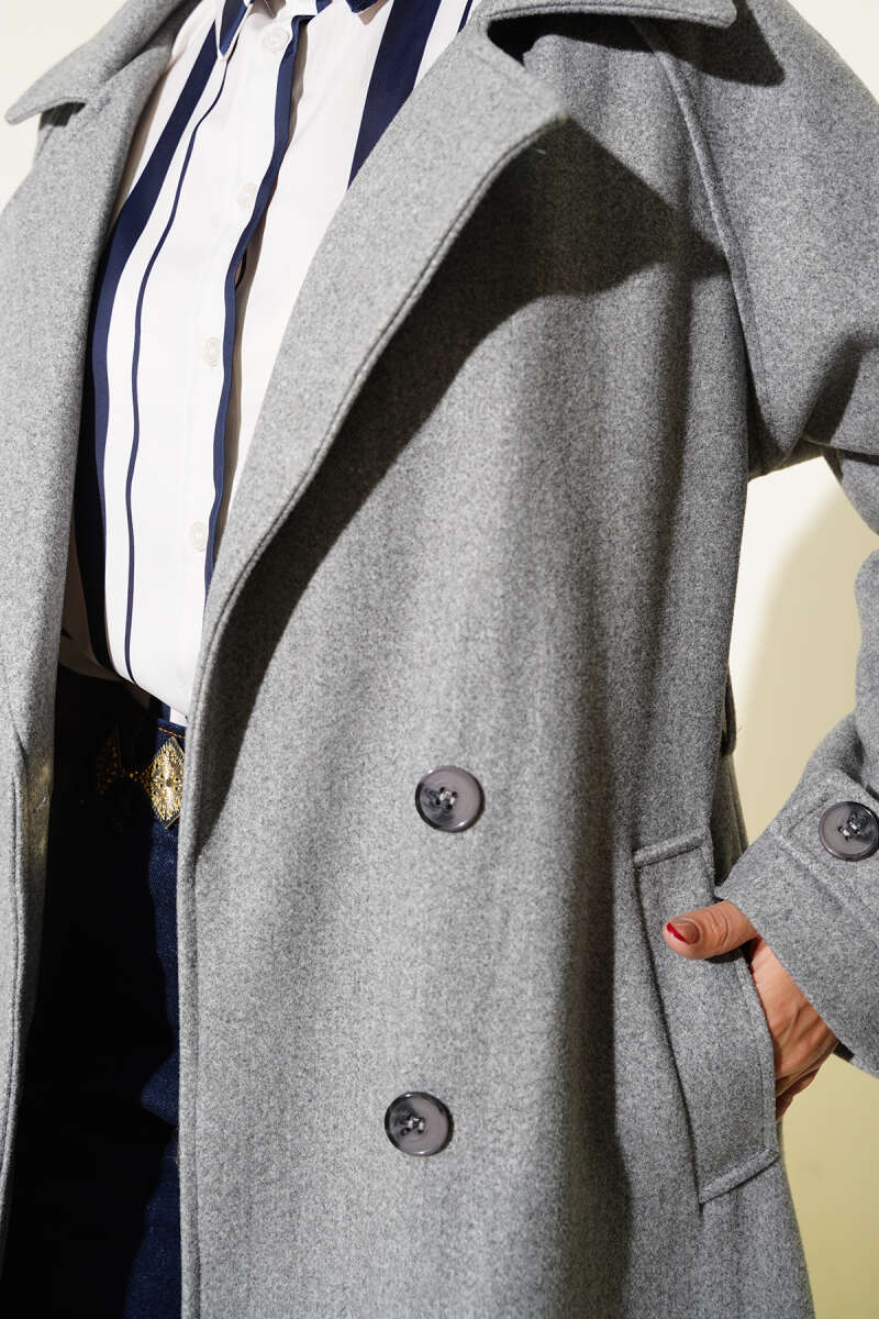 Tahta Düğmeli Kruvaze Yaka Kaşe Kaban Gri