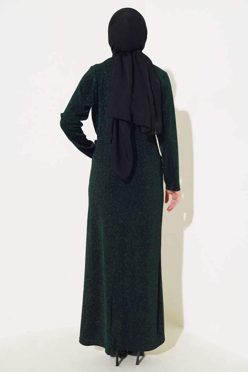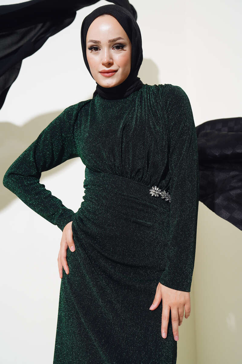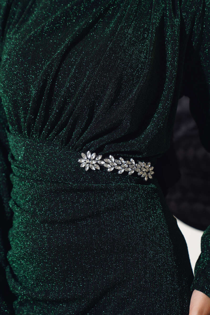 Taş Aksesuarlı Simli Elbise Zümrüt