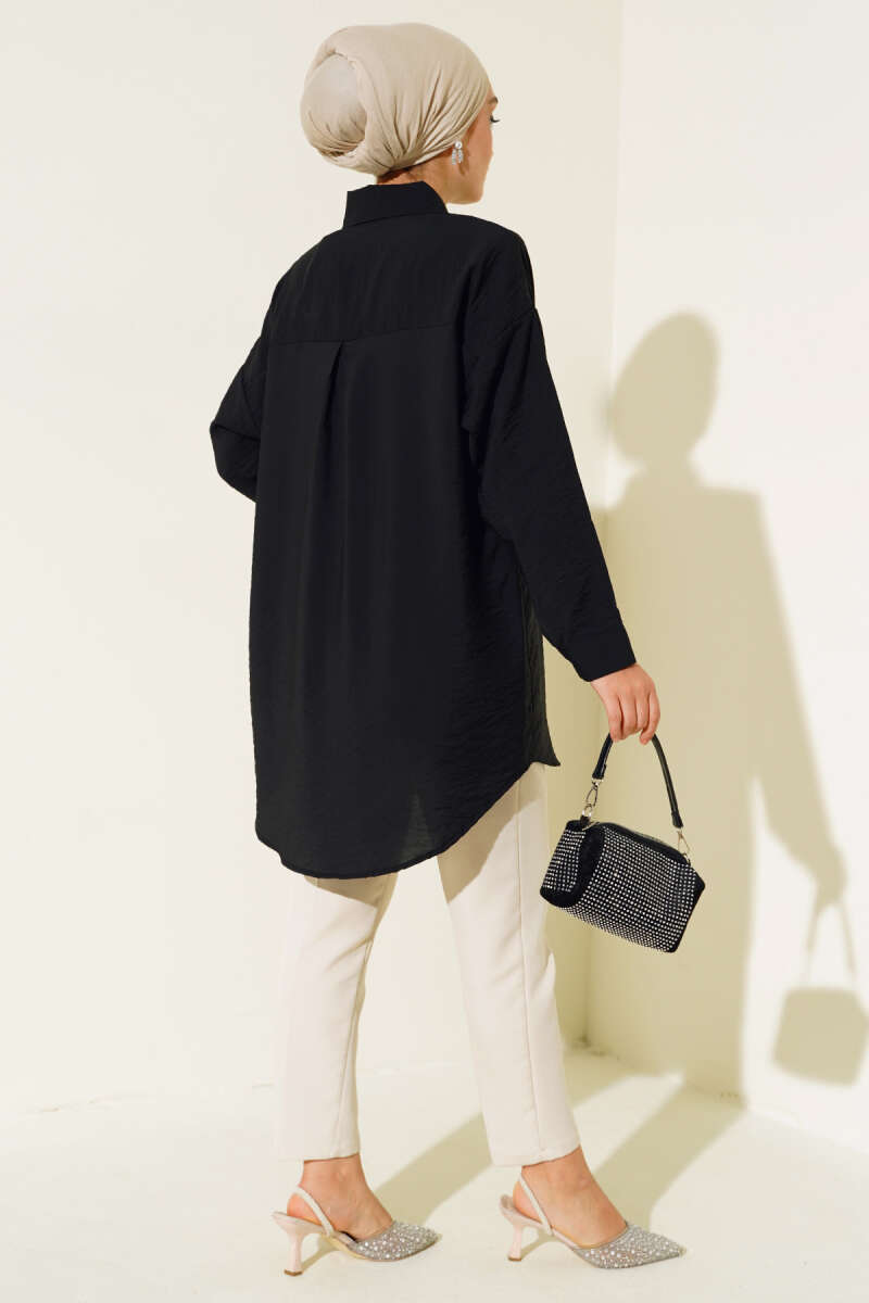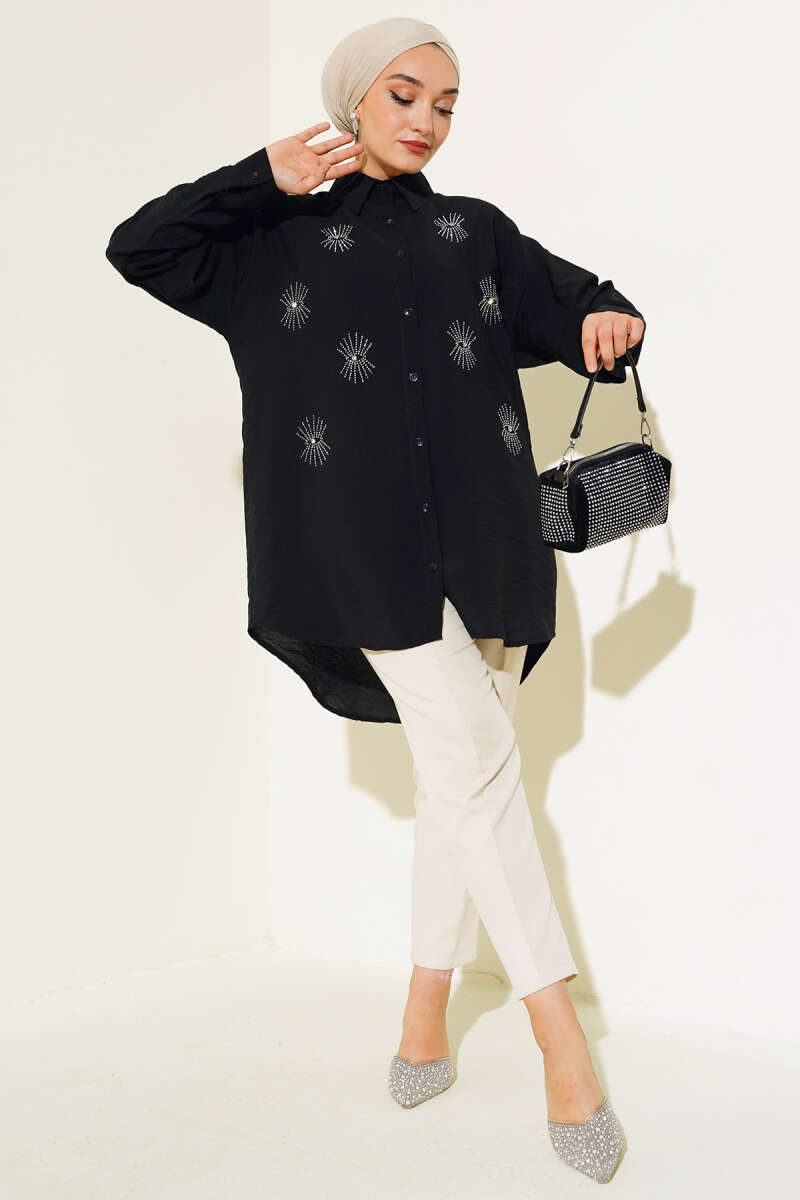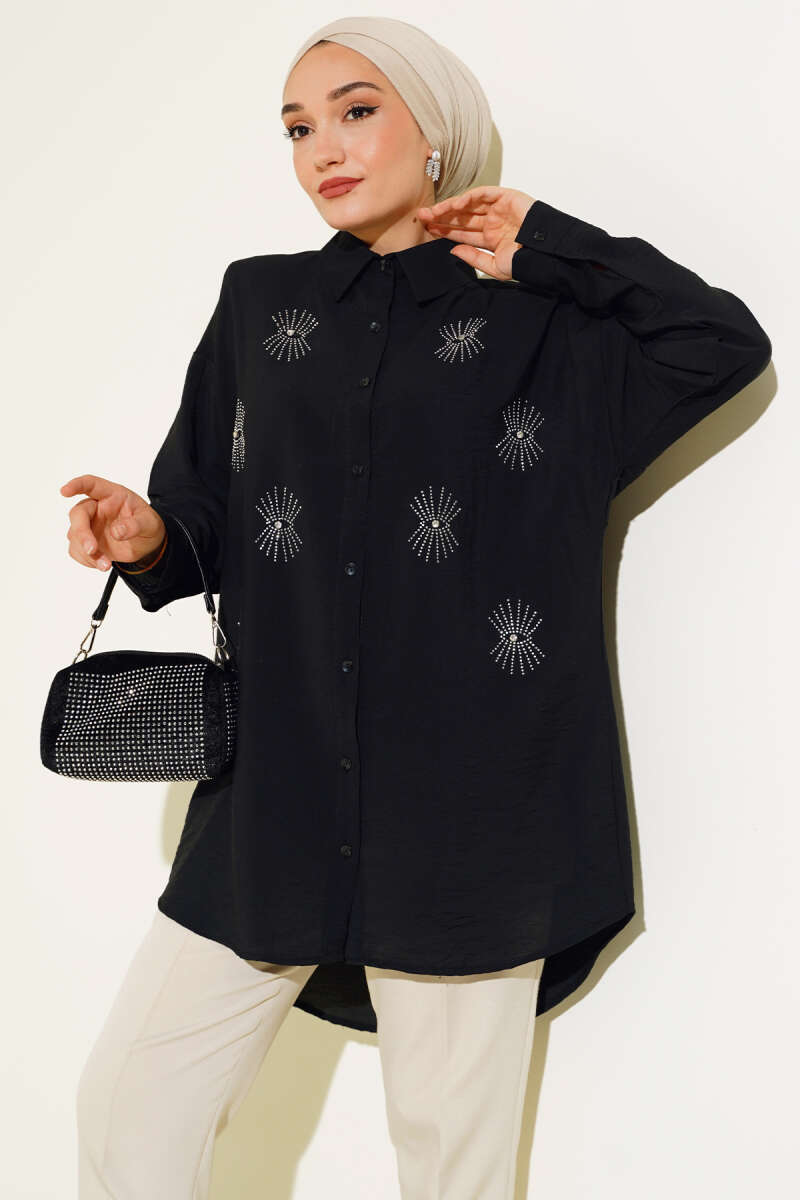 Taş Detaylı Ağaç Kabuğu Gömlek Siyah