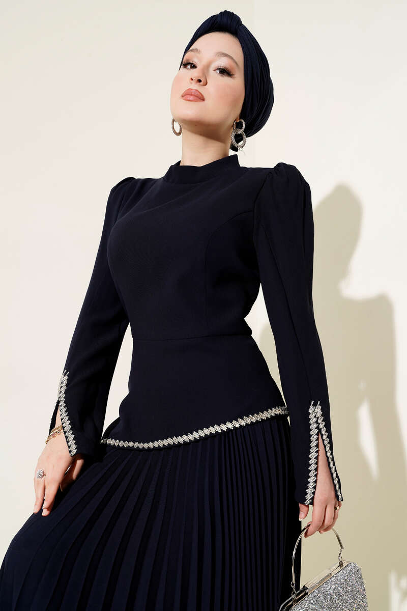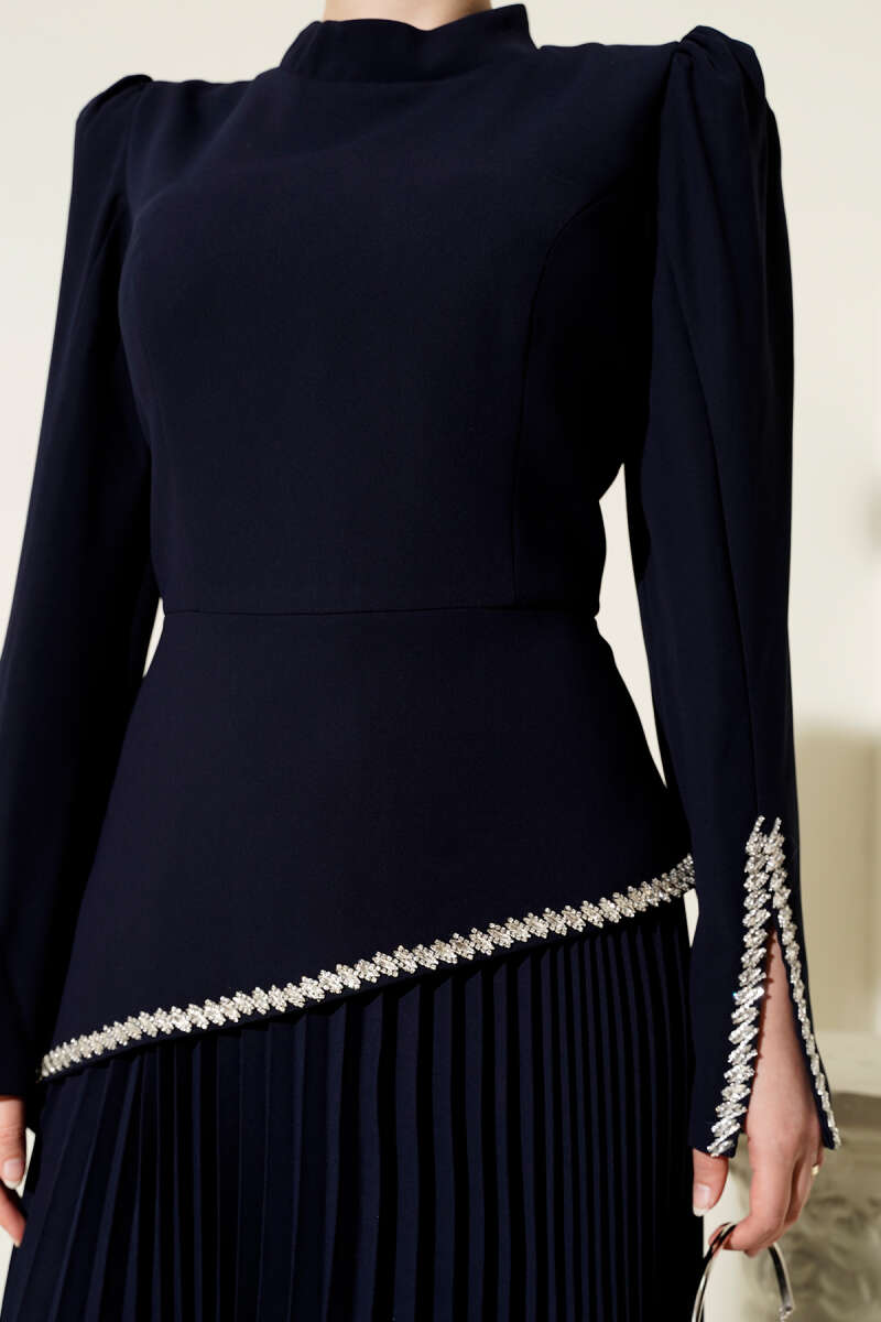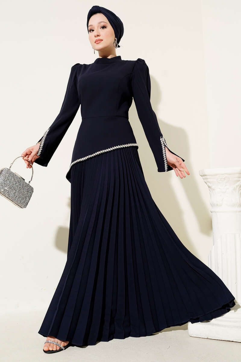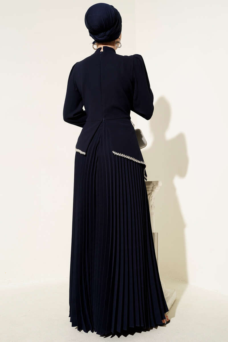 Pelerin Detaylı Pul Payet Abiye Elbise Lacivert