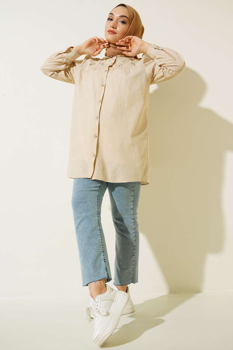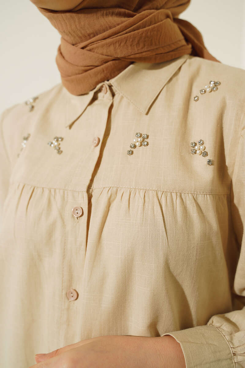 Yeni sezon model flam tuniğimiz üzerinde bulunan taş süslemeleriyle dikkat çekmektedir. Oversize olan gömleğimiz oldukça rahattır. Renk seçenekleri bulunmaktadır.
