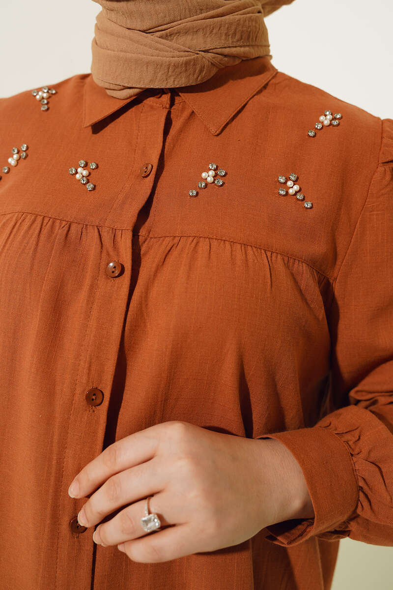 Yeni sezon model flam tuniğimiz üzerinde bulunan taş süslemeleriyle dikkat çekmektedir. Oversize olan gömleğimiz oldukça rahattır. Renk seçenekleri bulunmaktadır.