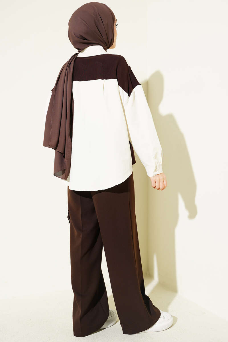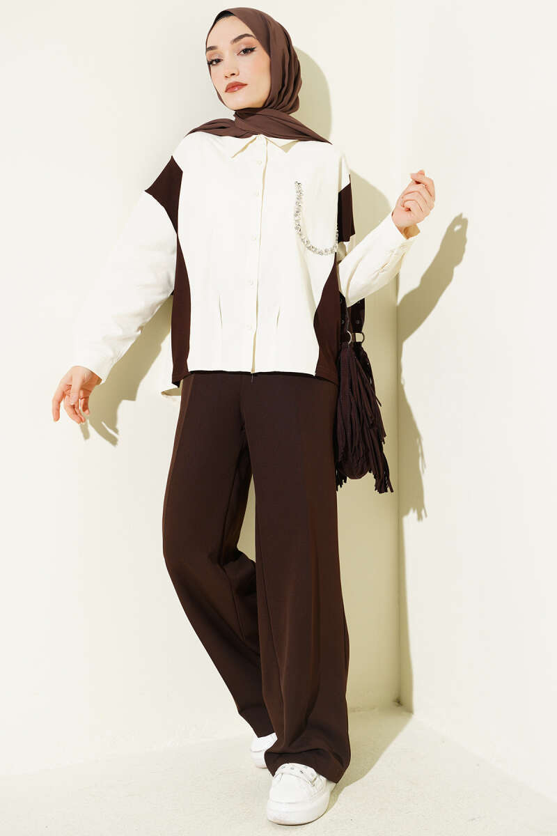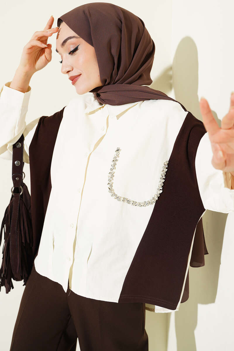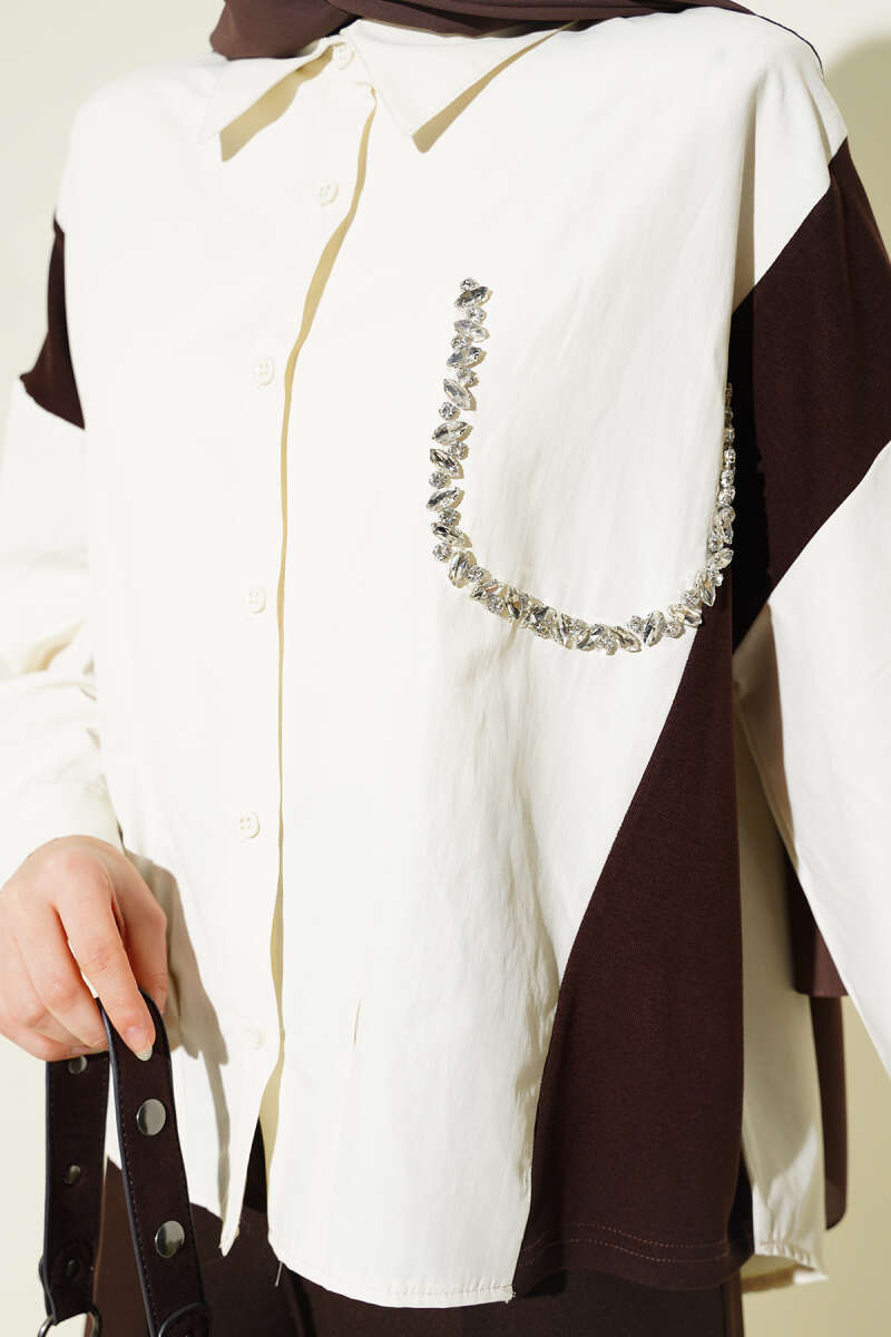 Yakası Ve Kol Manşeti Taşlı Gömlek Ekru
